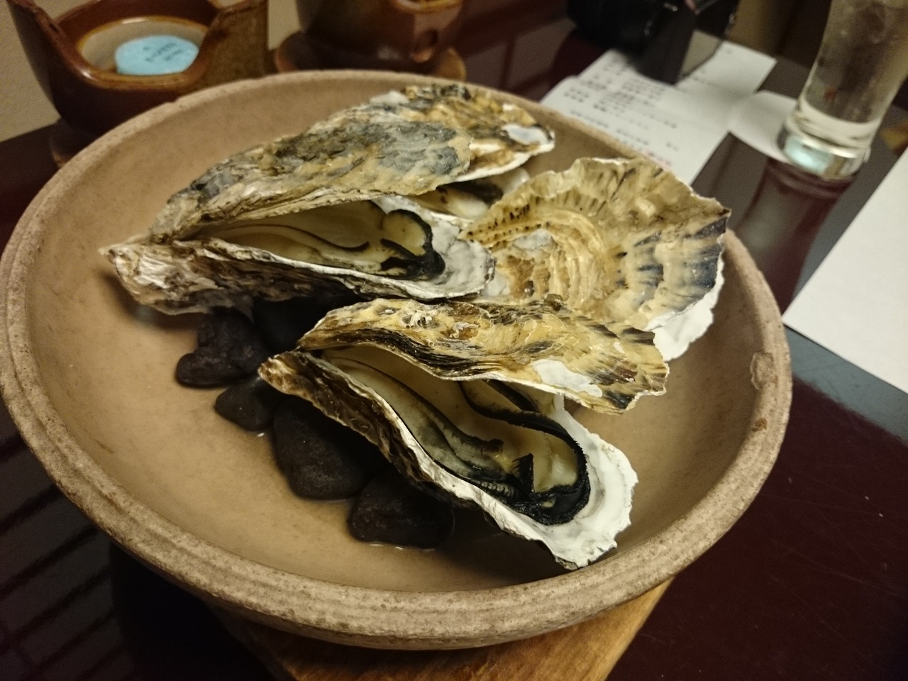 夕食の一品です。でっかい牡蠣が石に焼かれてて出てきます。