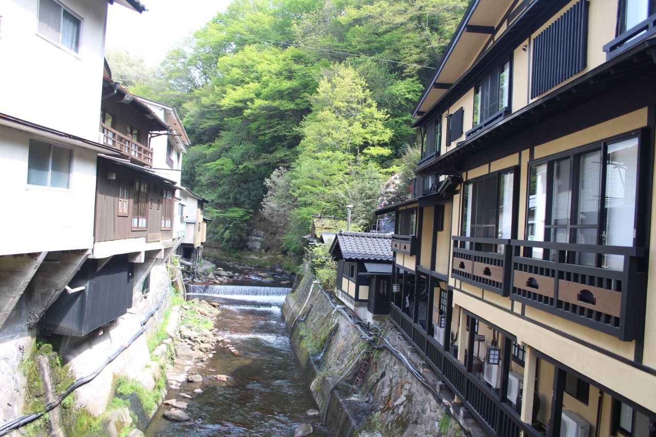 黒川温泉の川沿いに建ち温泉街が目の前でロケーション最高。