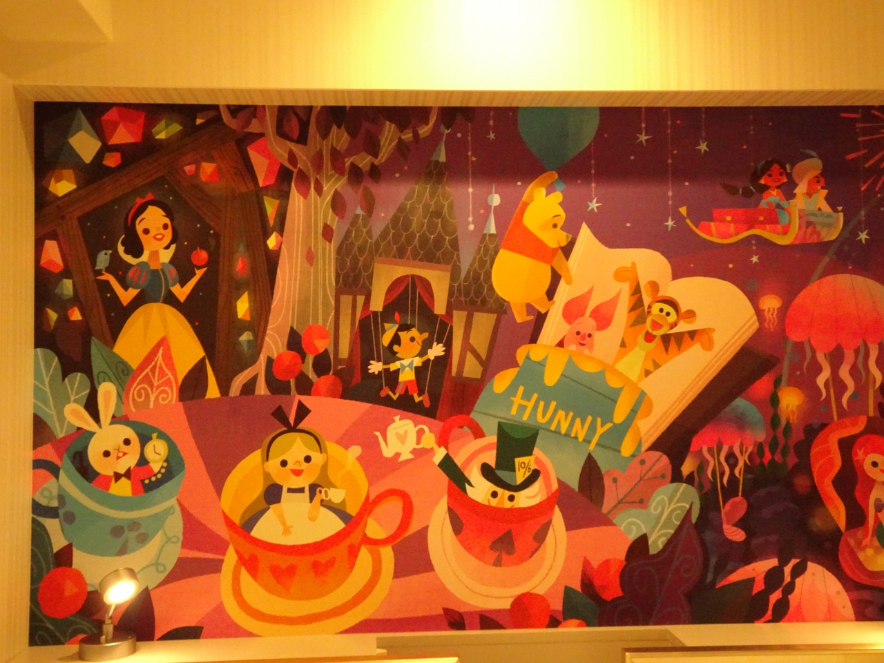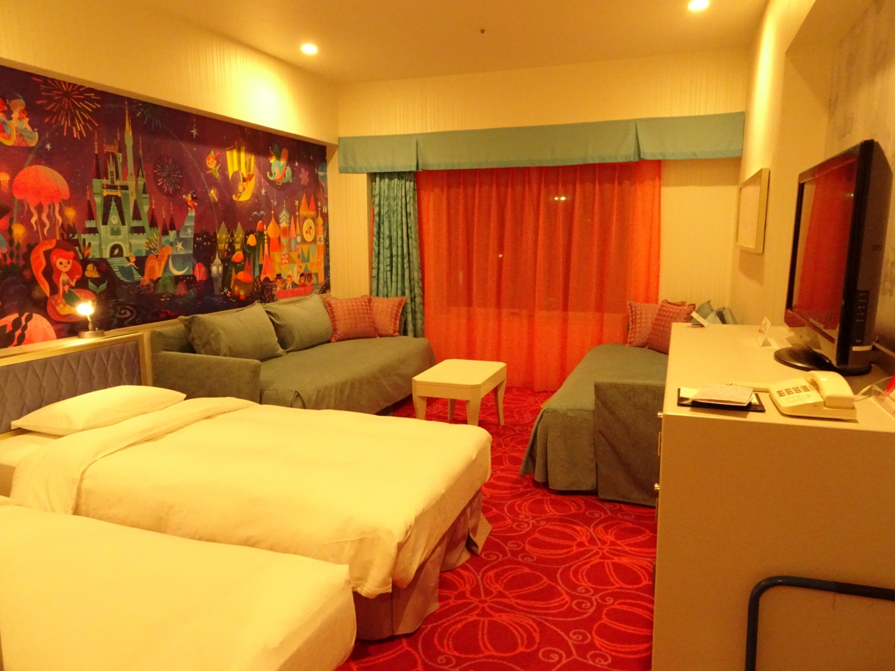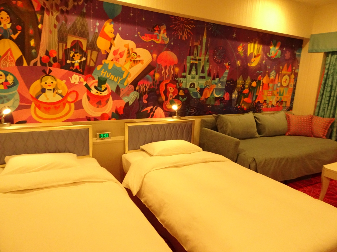 でも、子供がテレビで見て、このホテルに泊まってみたいというのでこちらに。結果、大正解でした。ホテルに入るとロビーにディズニーのデコレーション、夜は庭でチェシャ猫などがライトアップされていて、これだけでテンションがあがります。エレベーターに乗るとミッキーの声で案内があったり、部屋のスリッパもミッキーがついてたり、お部屋の壁の絵もかわいい。加湿器、パジャマもありました(荷物が減るので助かる)。