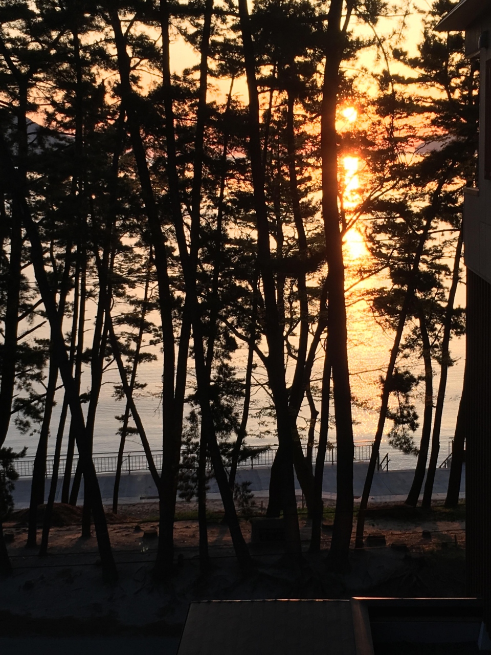 夕食は会席料理をお腹一杯堪能し、朝日を部屋の窓からのぞみ、出発前には女将から震災後の元気になるとりくみのお話しを聞き、大漁旗で送り出されました。