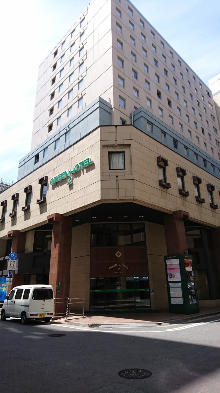 博多駅新幹線口からすぐの所にあるグリーンホテル2、この場所にかなり前からあるビジネスホテルです。ロビーはちょっと古い感じがしますが、フロントの方の対応も良く丁寧でした。チェックインが確か13時からと早いのも便利ですね。