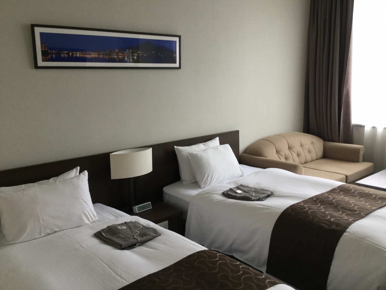 3)ツインベッドルームで、ソファもあり、ゆったりした部屋でした。ただ、お風呂、トイレは、ビジネスホテル並でした。女性陣二人と一緒なので、お風呂の狭さ、トイレとの一体型は、チョットガッカリな点でした。