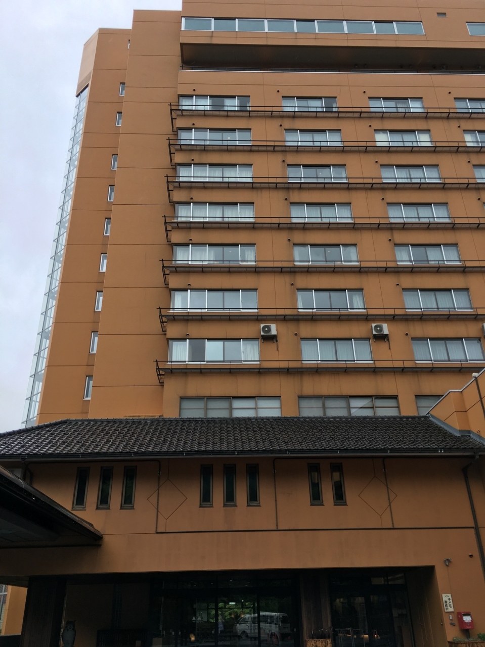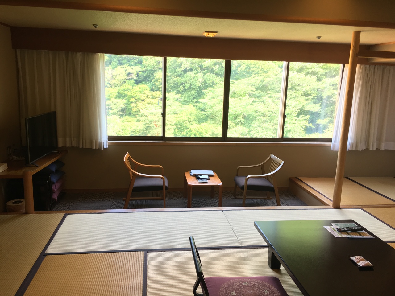 湯瀬温泉に一際目立つ茶色のホテルが湯泉ホテルです。三棟からなっていて大規模なホテルです。緑が多く川ぞいに立つ自然豊かなホテルです。部屋はスタンダードなタイプでしたが、2人では広さも十分で、窓からの眺望も良かったです。