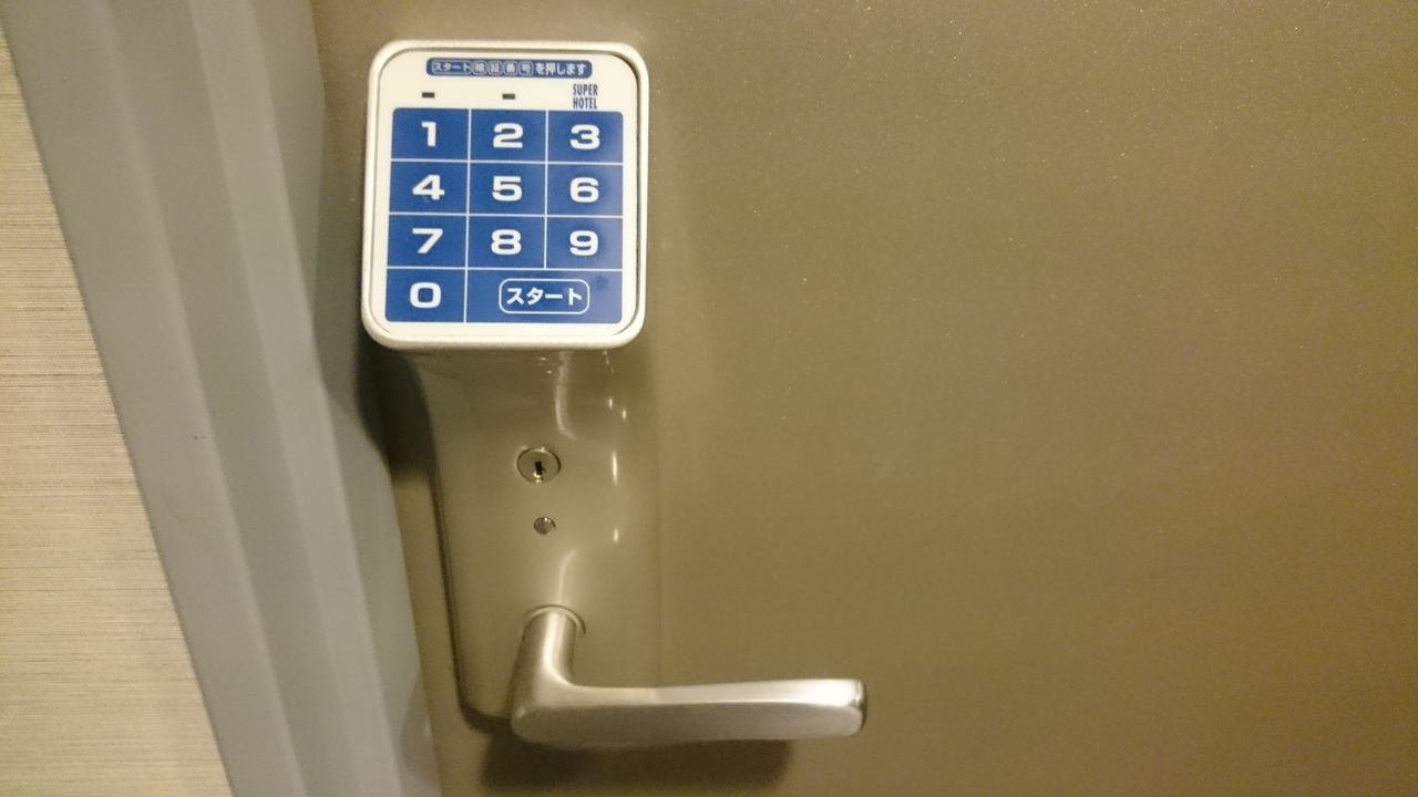 部屋の鍵は、あらかじめ指定された6桁の暗証番号なので、忘れて外出すると大変です。