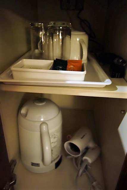スーツケースを広げるスペースもあるし、ポット、コップ、ドライヤーもありました。