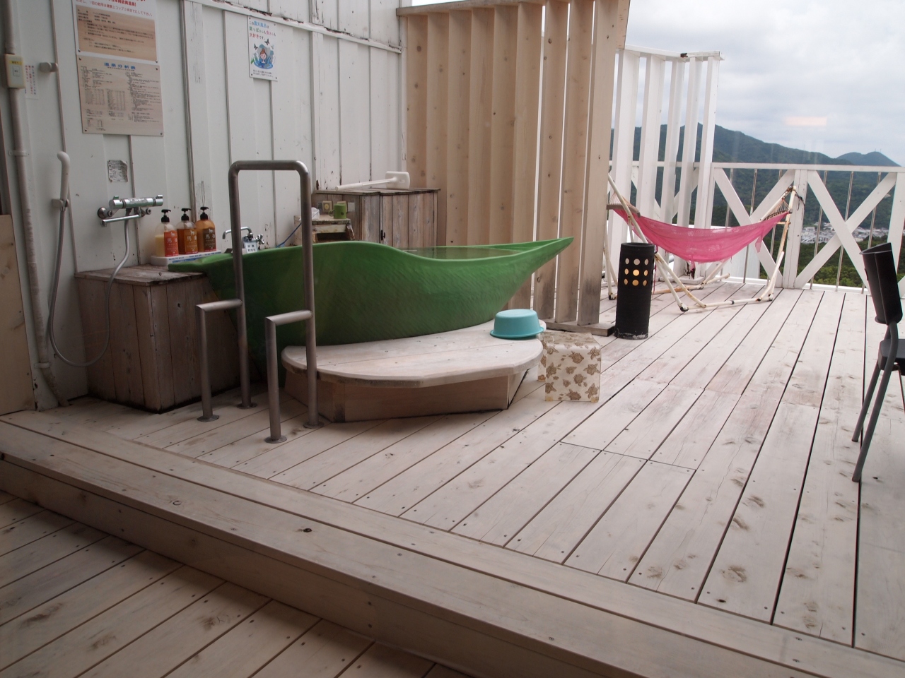 部屋は、普通の和室です。窓は広く、その先にウッドデッキがあり、ハンモックと露天風呂がありました。バスローブも用意されていて、のんびり海を眺めて過ごせそうですが、ハンモックは破れていて使えませんでした。露天風呂は、ぬるくてお湯も出なかったので、フロントに電話してスタッフに来てもらったのですが、すぐには直らず、夕食をとっている間に直してもらうことになりました。夕食後には雨が降ってきて、露天のところにはシートがかかるようになっていたのですが、端にあるのでシートの隙間から雨が入ってきてぬるくなるし、雨に打たれお湯もきれいじゃなかったので、ハンモックと露天は、ただ眺めるだけの置物でした。