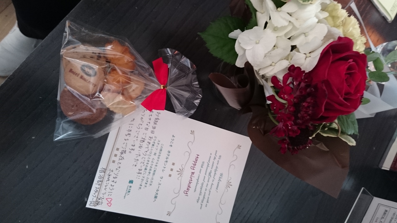 宿泊1日目が友人のお誕生日の旨伝えていると、お部屋にお花(ブーケ)とホテルのクッキーをサプライズしてくれました!