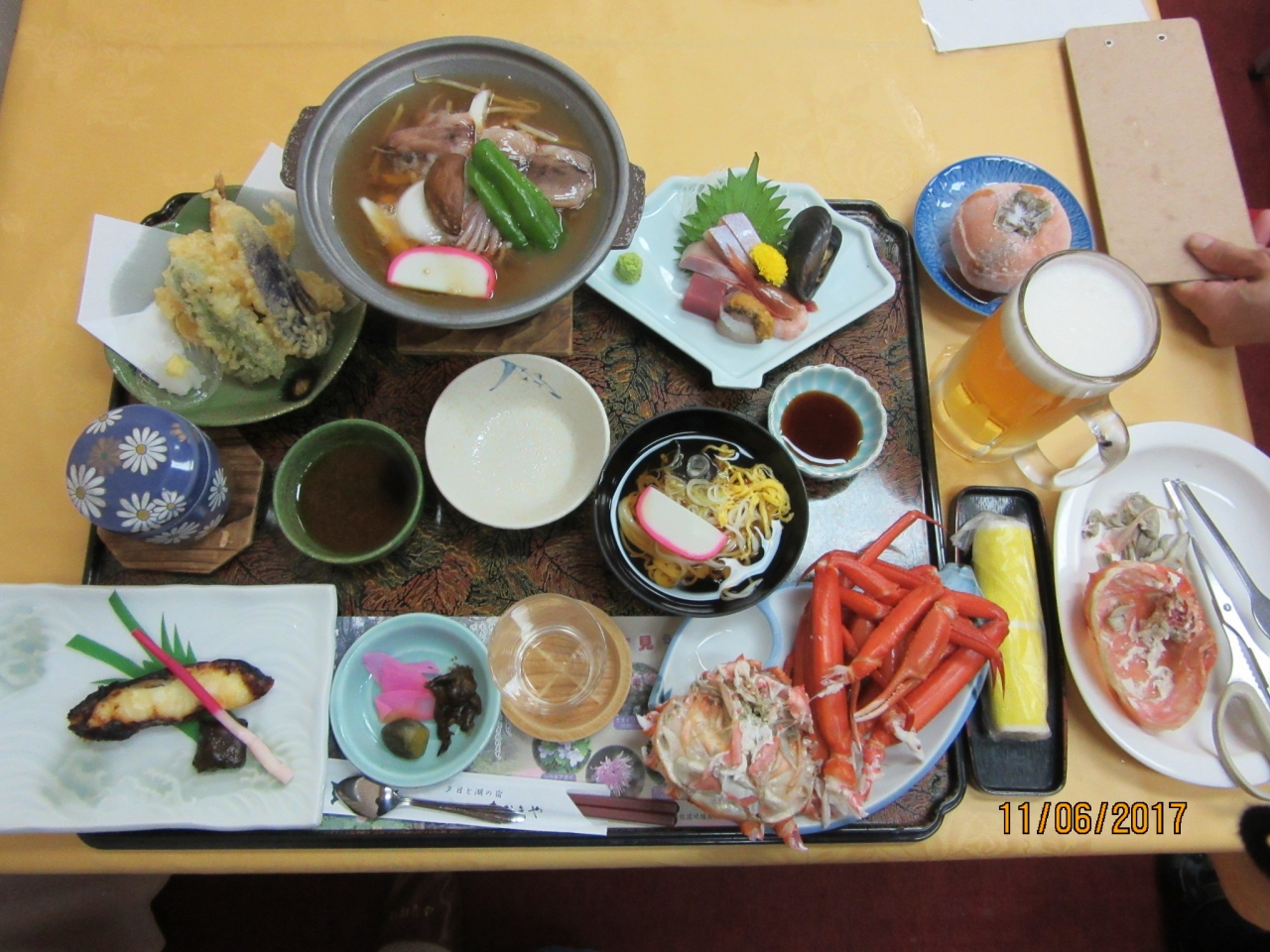 夕食は大広間で用意され、ずわい蟹が一杯ついて豪華で大満足。仲居さんがついて給仕
