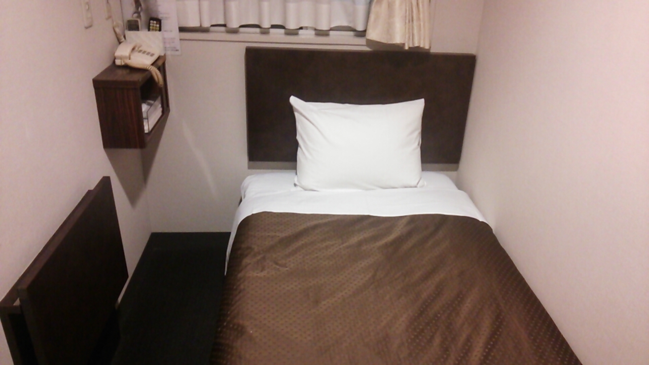 当日は1泊4900円するシングルルームのプランを利用したいのですが、バス・トイレ付きながら部屋は通常の半分~3分の2程度の広さとやや狭めでした。その事もあってかベットもやや狭めで、体格の良い方ならば幅がギリギリになるかもしれませんので注意が必要です。
