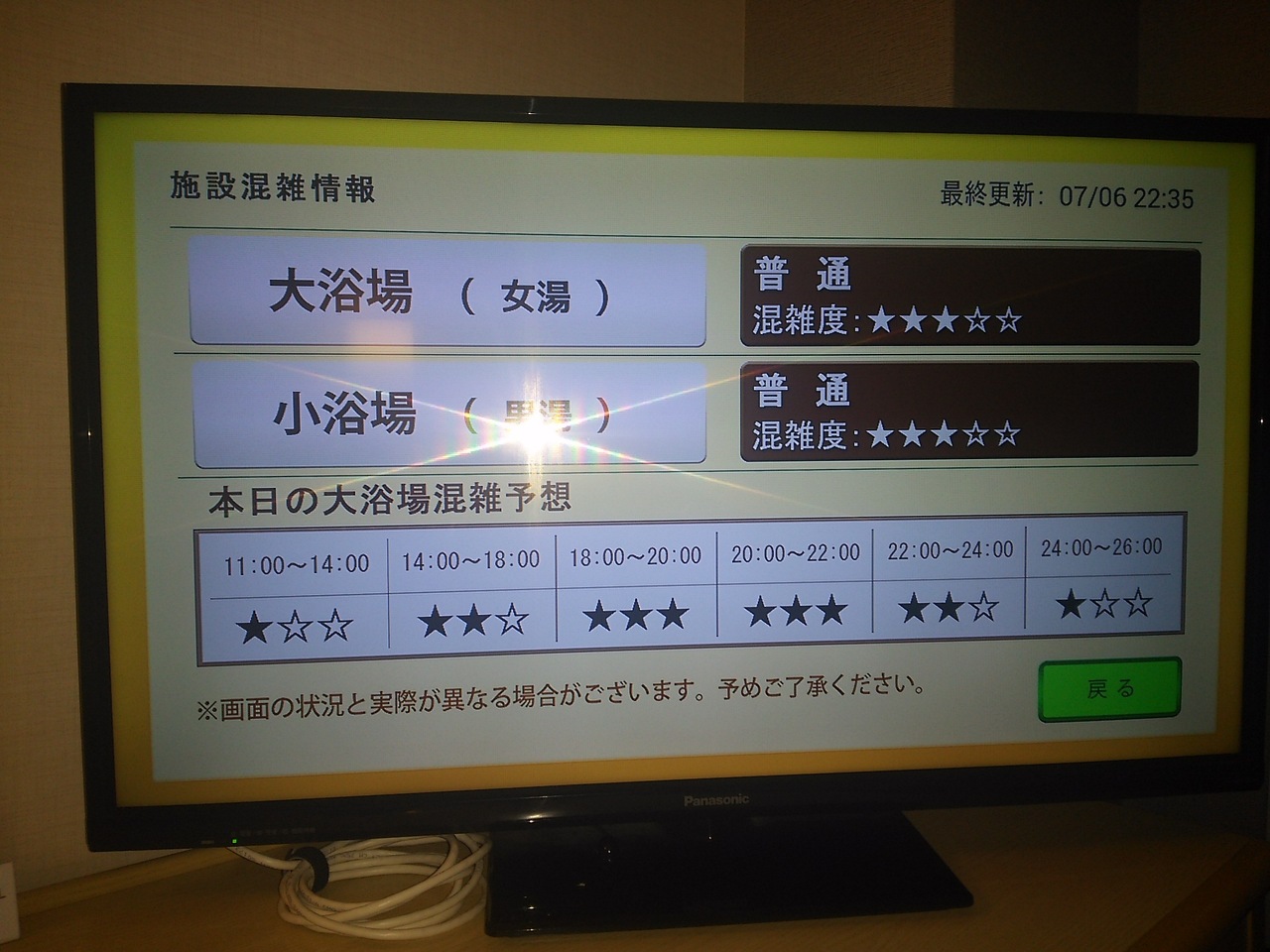 少しにぎやかなところからは離れていますが、地下に大浴場があり、疲れがとれます。部屋数もあり、大浴場は混むこともあるようですが、大丈夫でした。確かにテレビの初期画面のホテル案内で混雑状況を確認することが出来ます。