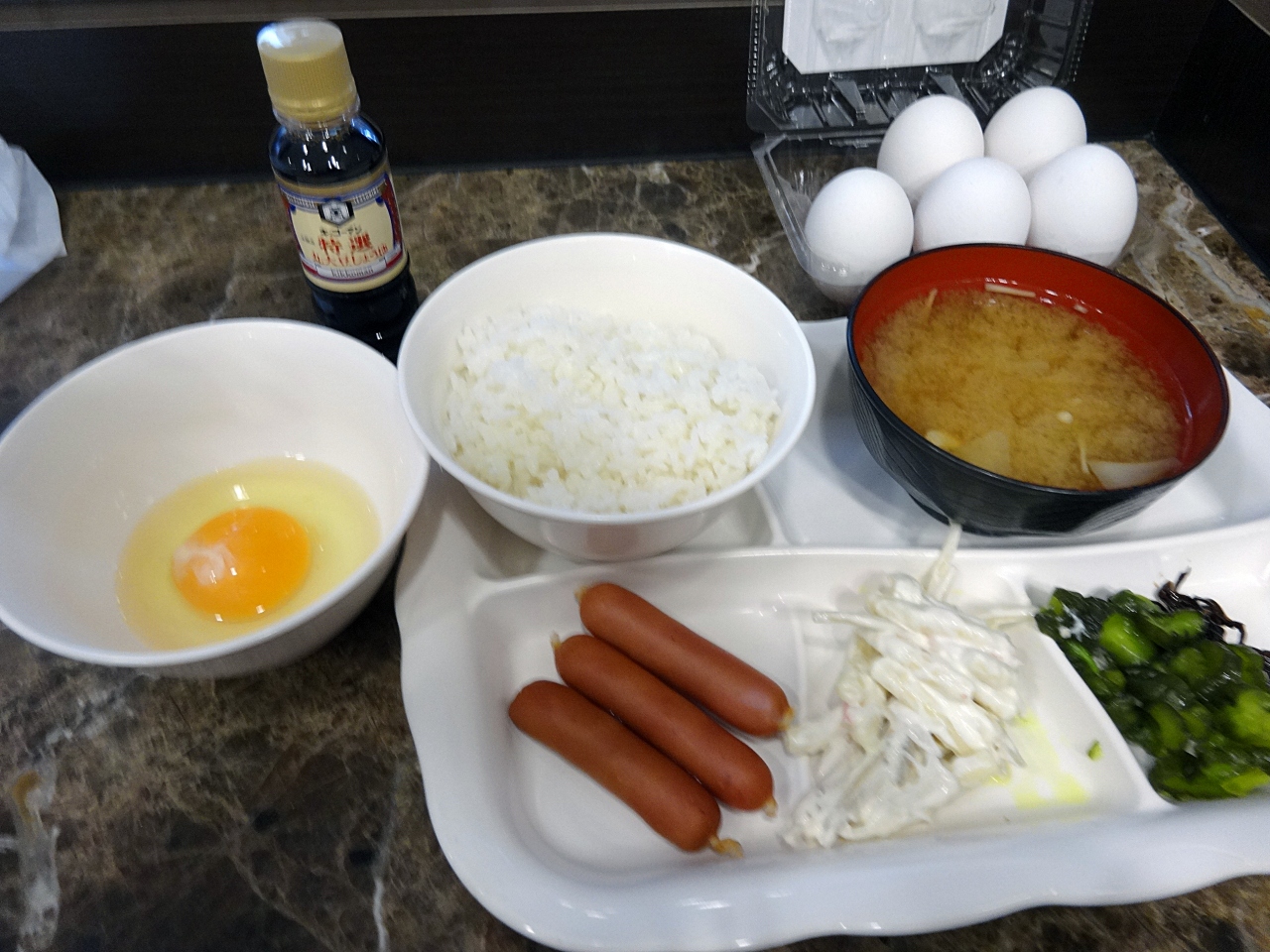 朝食はコンビニで調達した生卵を持参して【玉子がけごはん】にしました(^^♪
