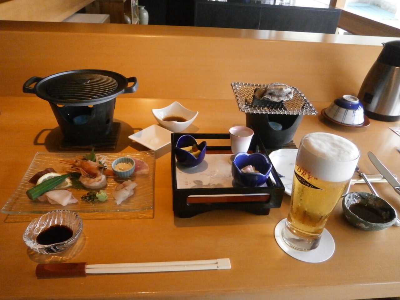 夕食はカウンターでのんびり懐石料理が楽しめます。2種類のメイン料理も選べて、どれも美味しくお腹いっぱいいただきました。
