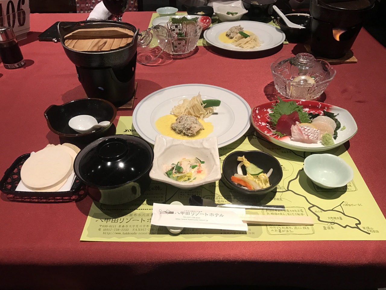 場所は、青森駅からJRバス東北「十和田湖行き」に乗車して約1時間、八甲田ロープウェイ駅前で下車、徒歩約3分。部屋は、和室でしたが畳が擦り切れ、天井の破損など、補修が必要に思いました。地元の食材を使った夕食は、味、量ともに大満足でした。温泉は泉質、温度もほどよく、のんびり入る事ができました。