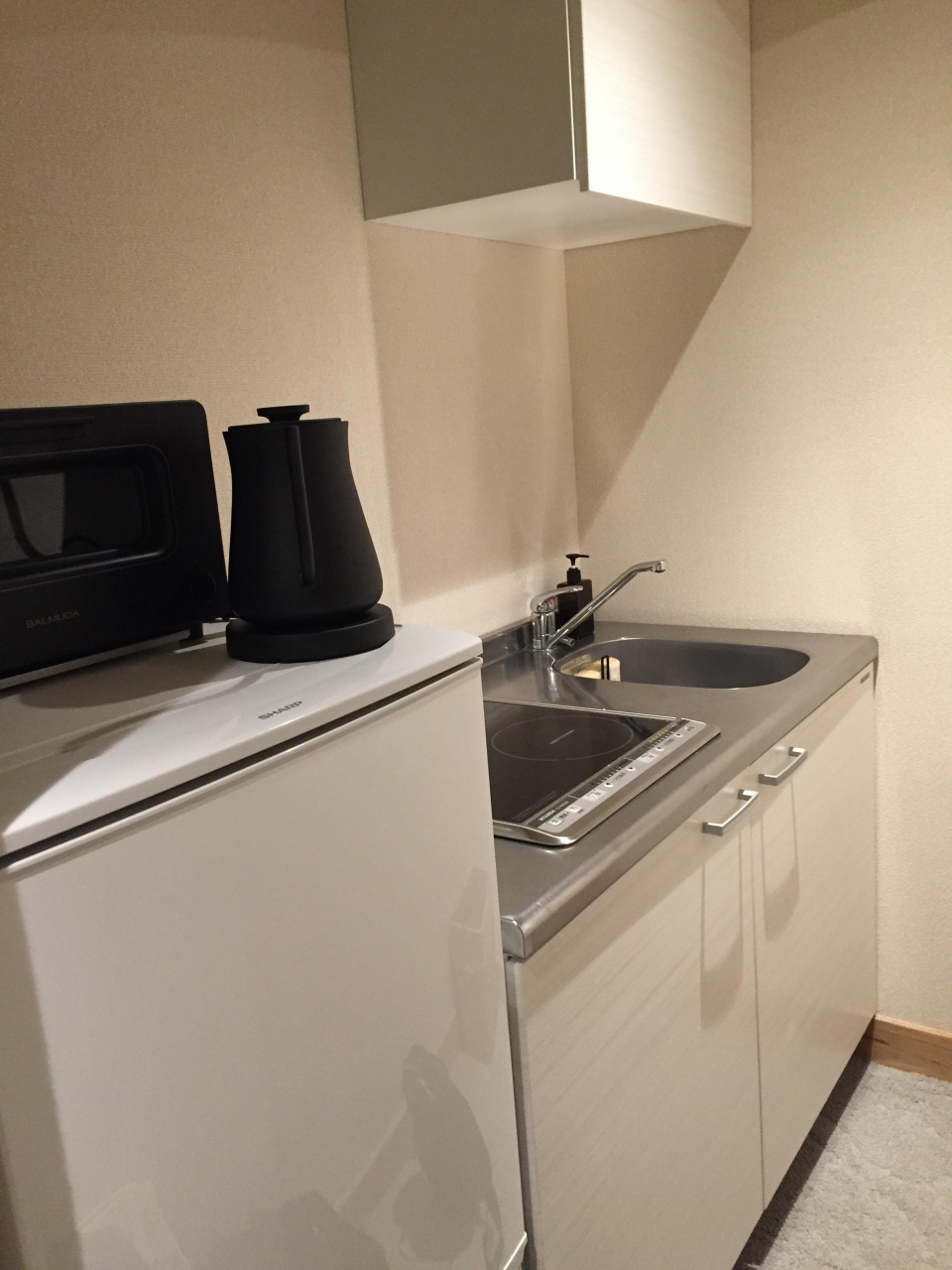 その代わり、冷蔵庫には人数分の無料ミネラルウォーターが入っていたり、備え付けのトースターと電気ケトルがバルミューダだったり、お茶用のカップがアウトドア用のアルミカップだったり、おしゃれな演出が効いています。