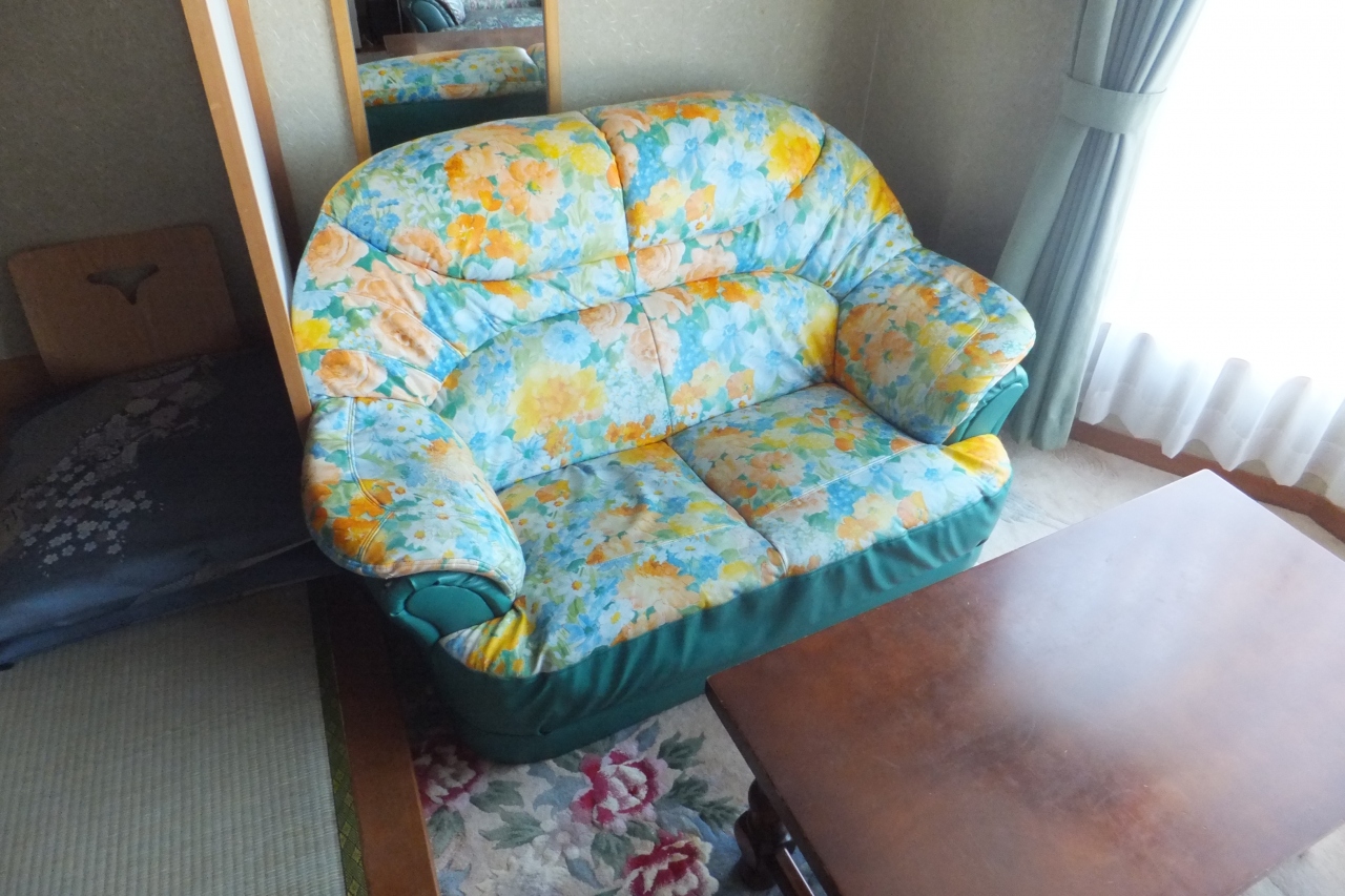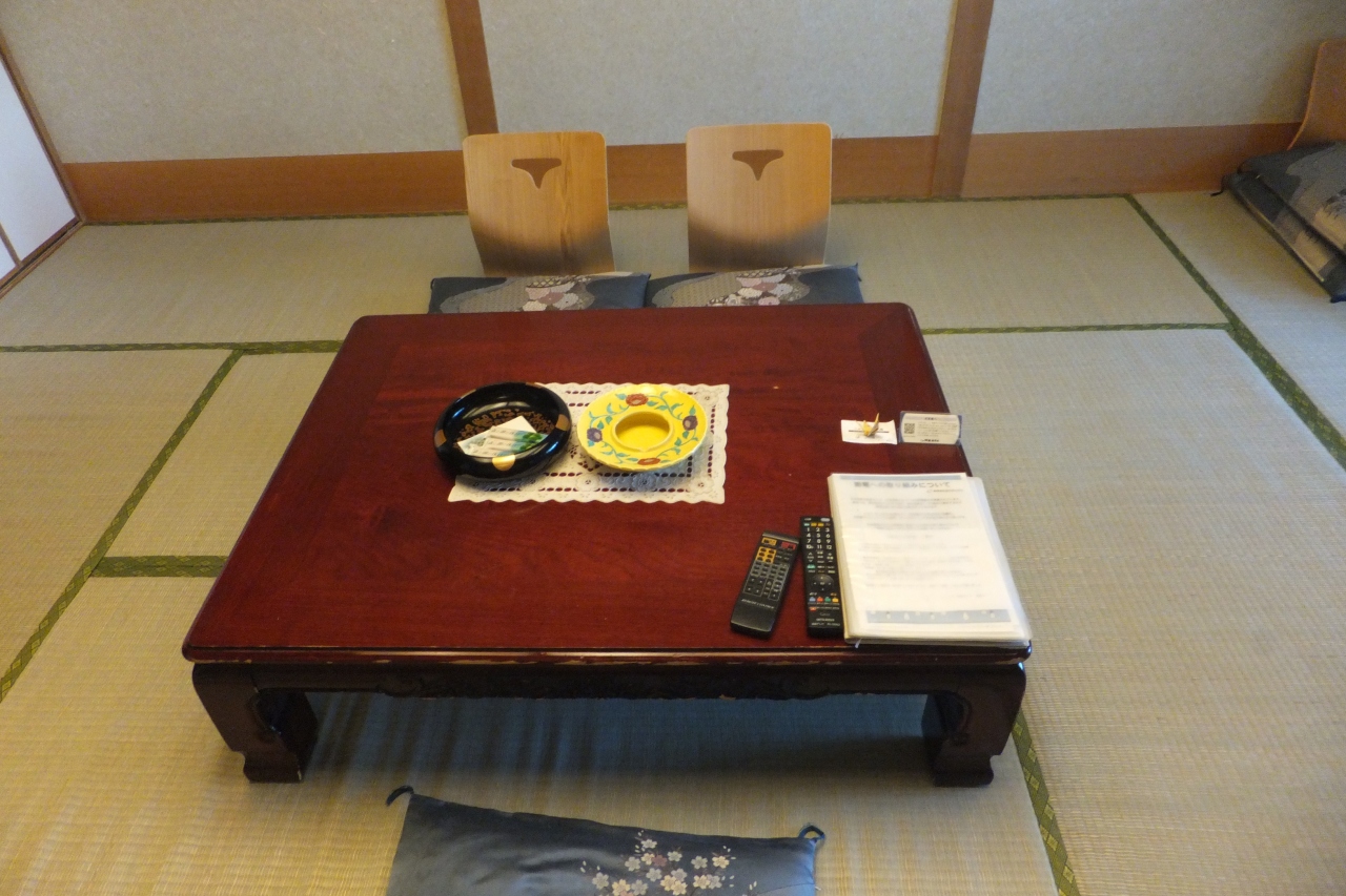 典型的な座卓です。卓上に清掃係員の名刺と折鶴がありました。