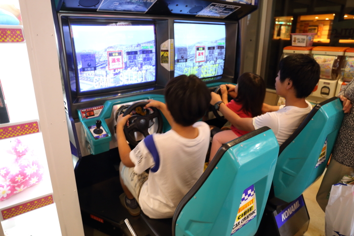 室内には滑り台付きの大きなプールがあり、またゲームセンター、6レーンの