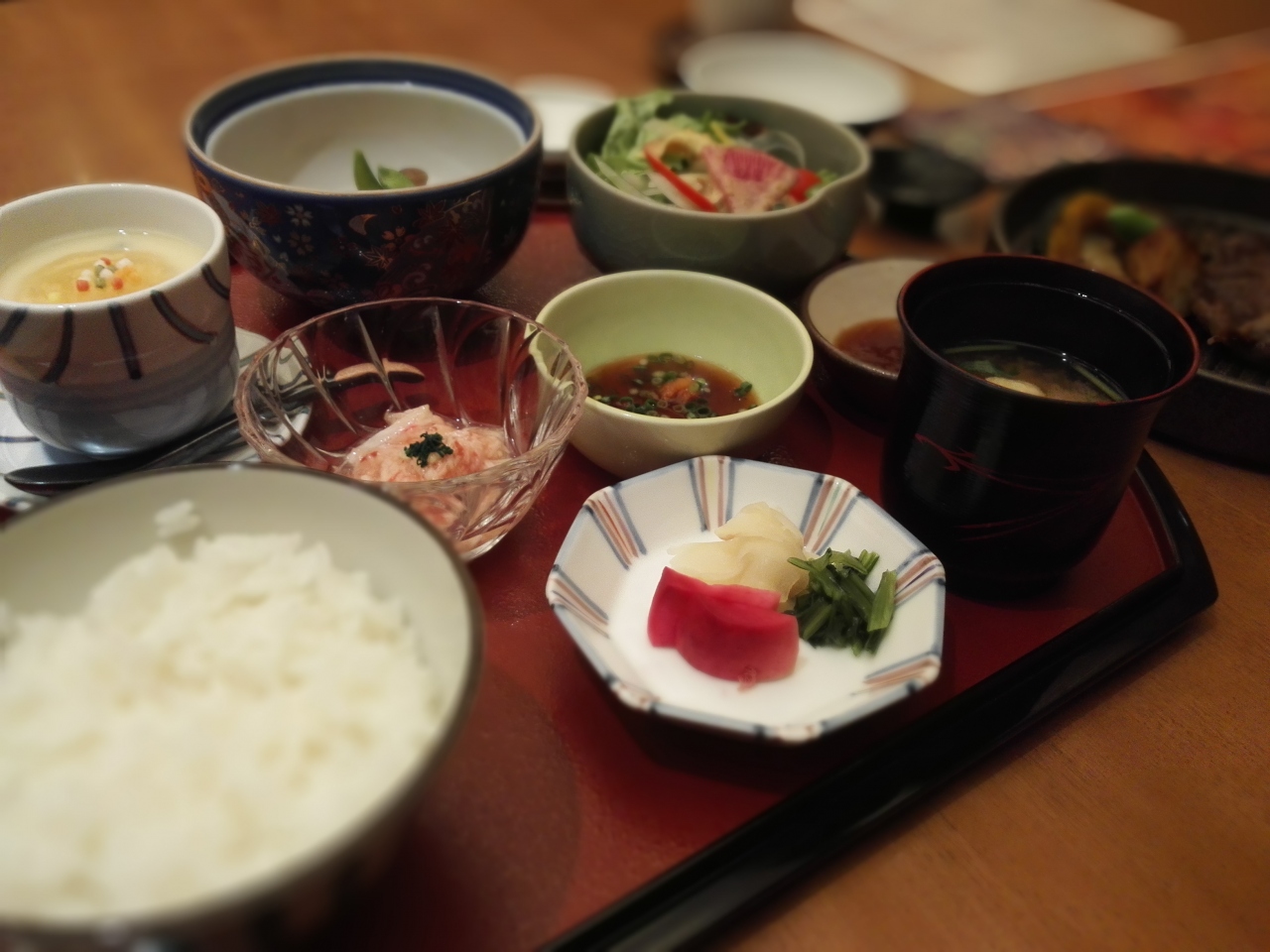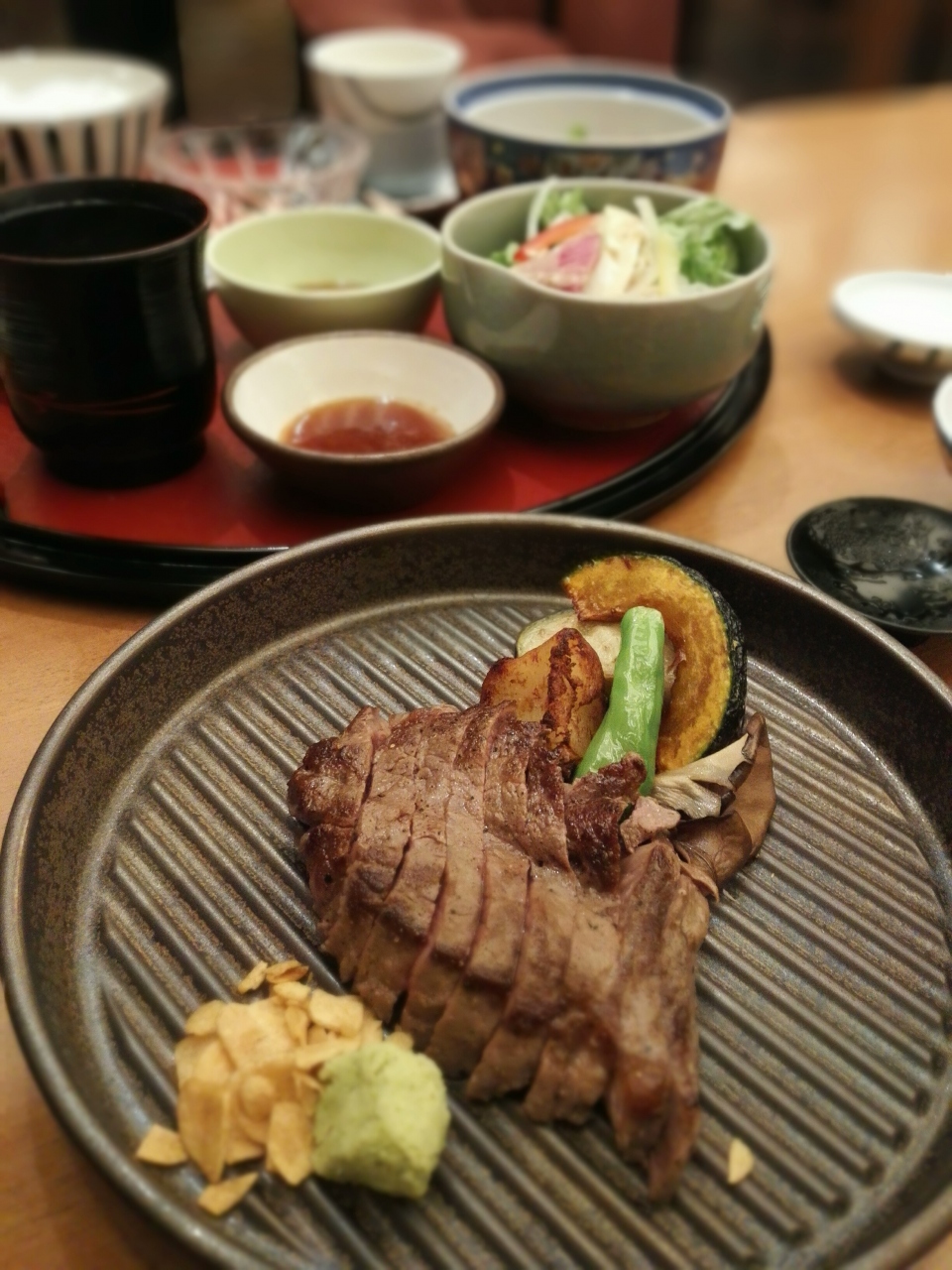 包括航空券のプランではプラス千円程度の『十勝牛サーロインステーキ御膳』だったが存外豪華。後程品書きを確認したら一般には約4千円で提供している料理だった。