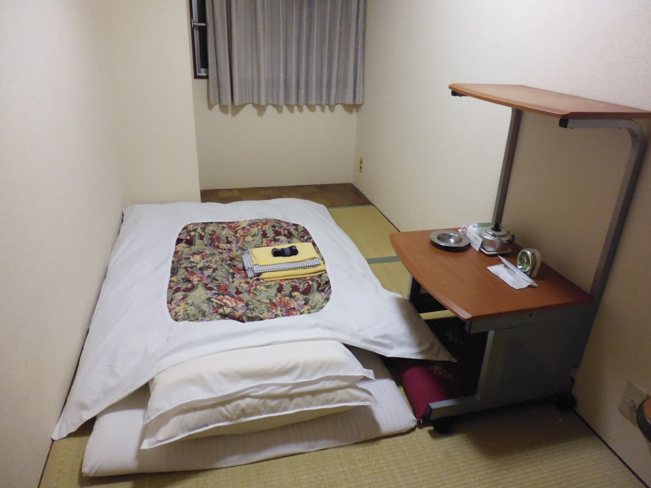 上野駅で山手線の電車を降りてから,徒歩で15分ほどでした.洗面所,トイレ,風呂は共同でした.禁煙部屋を予約できず,喫煙部屋でした.仕方ないのかもしれませんが,チェックイン後,初めてはいった時は臭いが結構気になりました.お風呂には下駄箱がなく,入浴後に履いたスリッパが誰のか,わからなくなります.部屋は和室3畳+板間で,仕事はしにくかったです.ティッシュは部屋になく,フロントでポケットティッシュをもらいました.1階の共用スペースに,電子レンジ,パソコンなどがありました.入室時,すでに布団が敷いてありました.これがかなりのせんべい布団.直接畳の上で寝るのと大差ない感じでした.