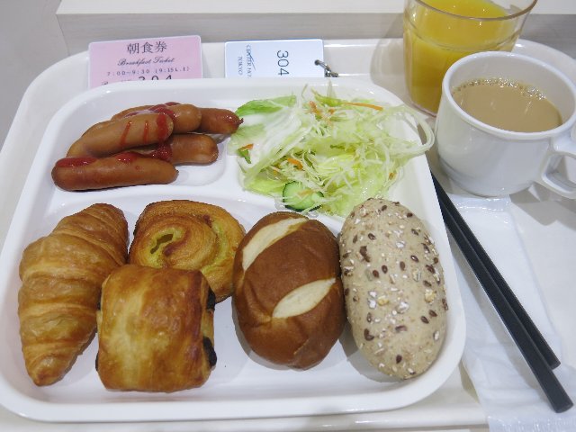 優待券の利用でも朝食サービスあり。7時からで、隣のセブンイレブンが会場。パンの種類が多く、良かったです。