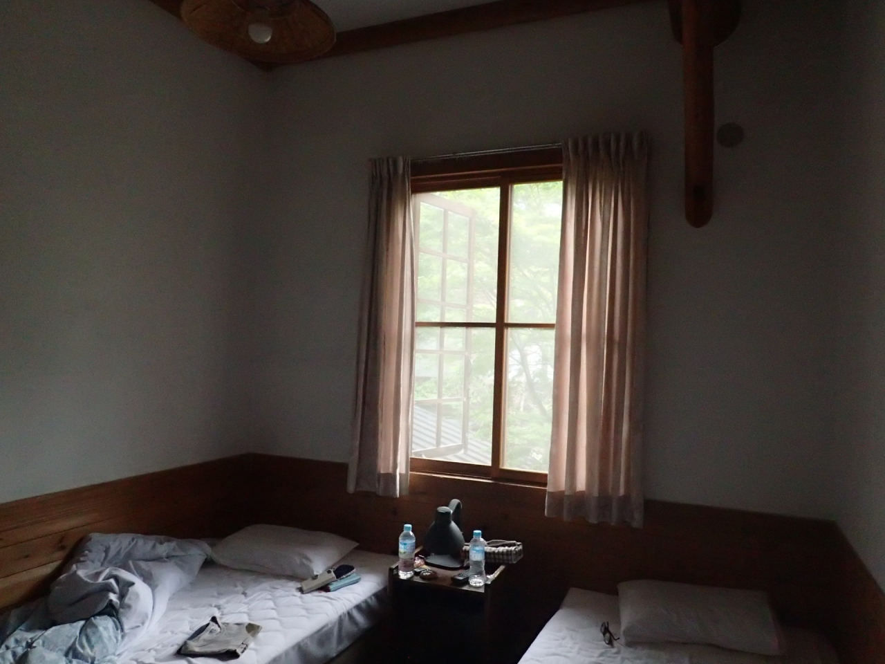 昔からある古い山小屋風ペンションです。太い丸太張りの天井がとても雰囲気がありました。食事がオイルフォンデュと焼魚とお豆腐でした。量は十分でしたが、料理は殆ど手が加えられておらずが物足りなさを感じました。夜は今回の旅で一番よく眠れました。