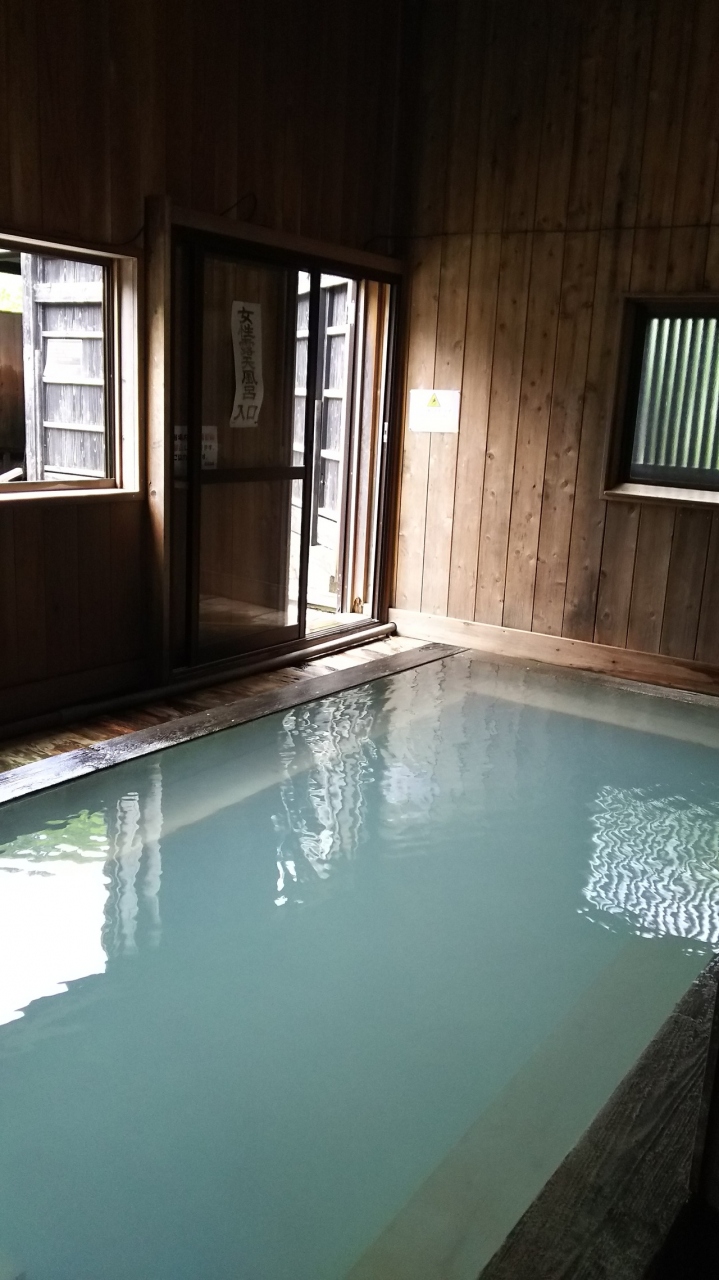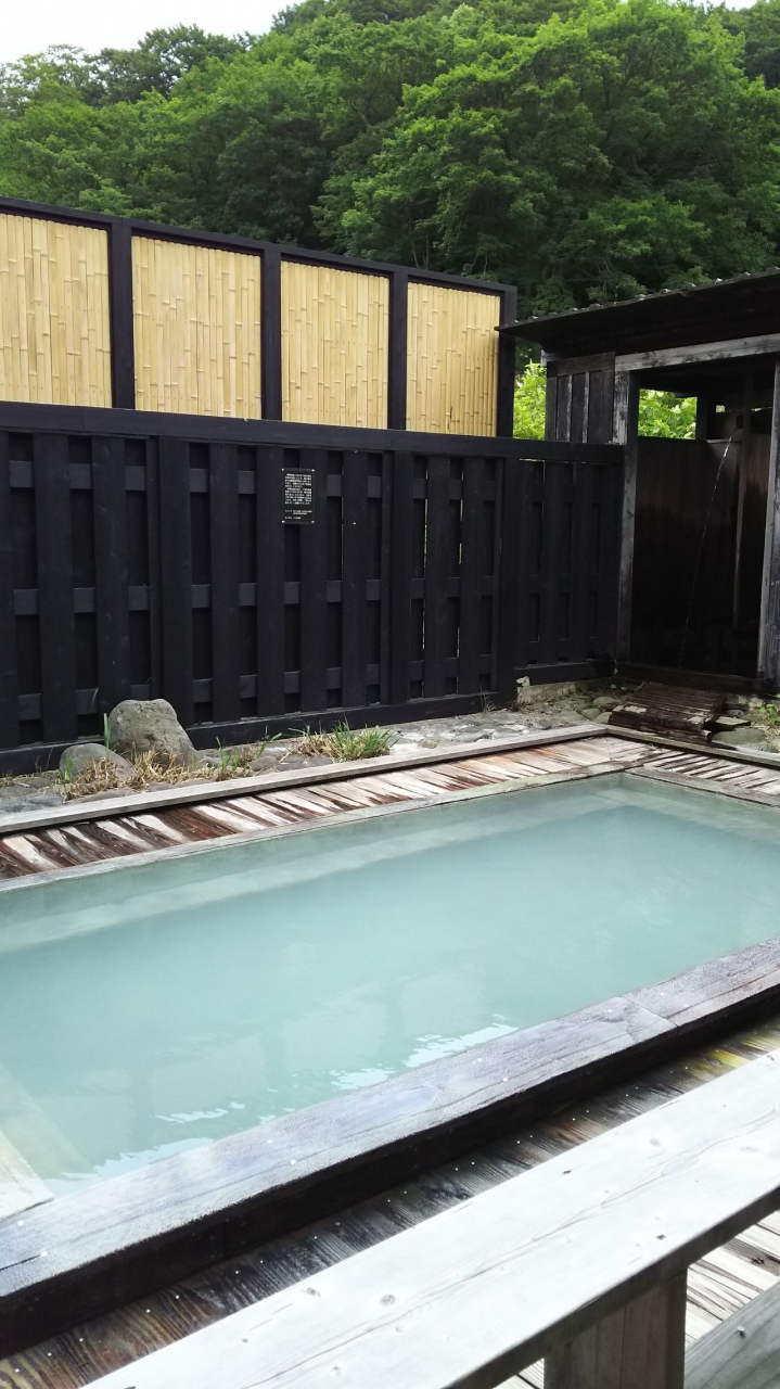 お湯は黒湯ではなく白濁したさらっとしたお湯で、特に露天風呂は温めで長く入っていられます。
