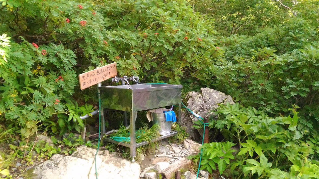 トイレは外にあり。屋内はなし。女性用個室1つ。男女兼用個室2つ。男性小用1つ。個室はすべて和式のポットン便所。使用後の紙はゴミ箱に捨てる。まともに息を吸うとせき込むくらいの臭い。トイレの外に手洗い場あり。洗面台も外にあり。両方とも水は出た(ここより上にある仙丈小屋はトイレに手洗いの水がなく、手持ちの飲み水で手を洗った)。