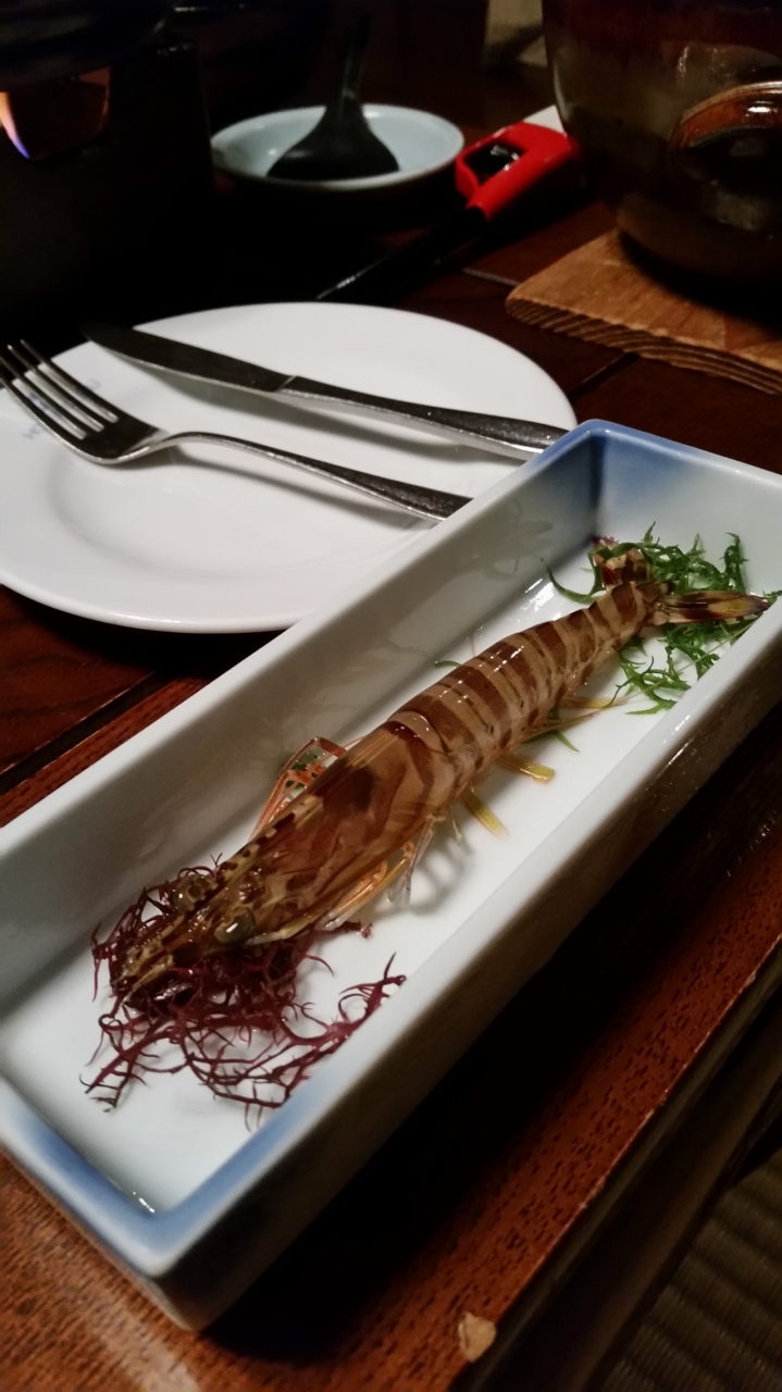 洋室と和室が一緒のプランを利用。アワビや車海老の踊り食いなど、夜の部屋食は良いタイミングで持って来てくれるのもうれしい。朝食バイキングも、貝汁が特に美味しかった。