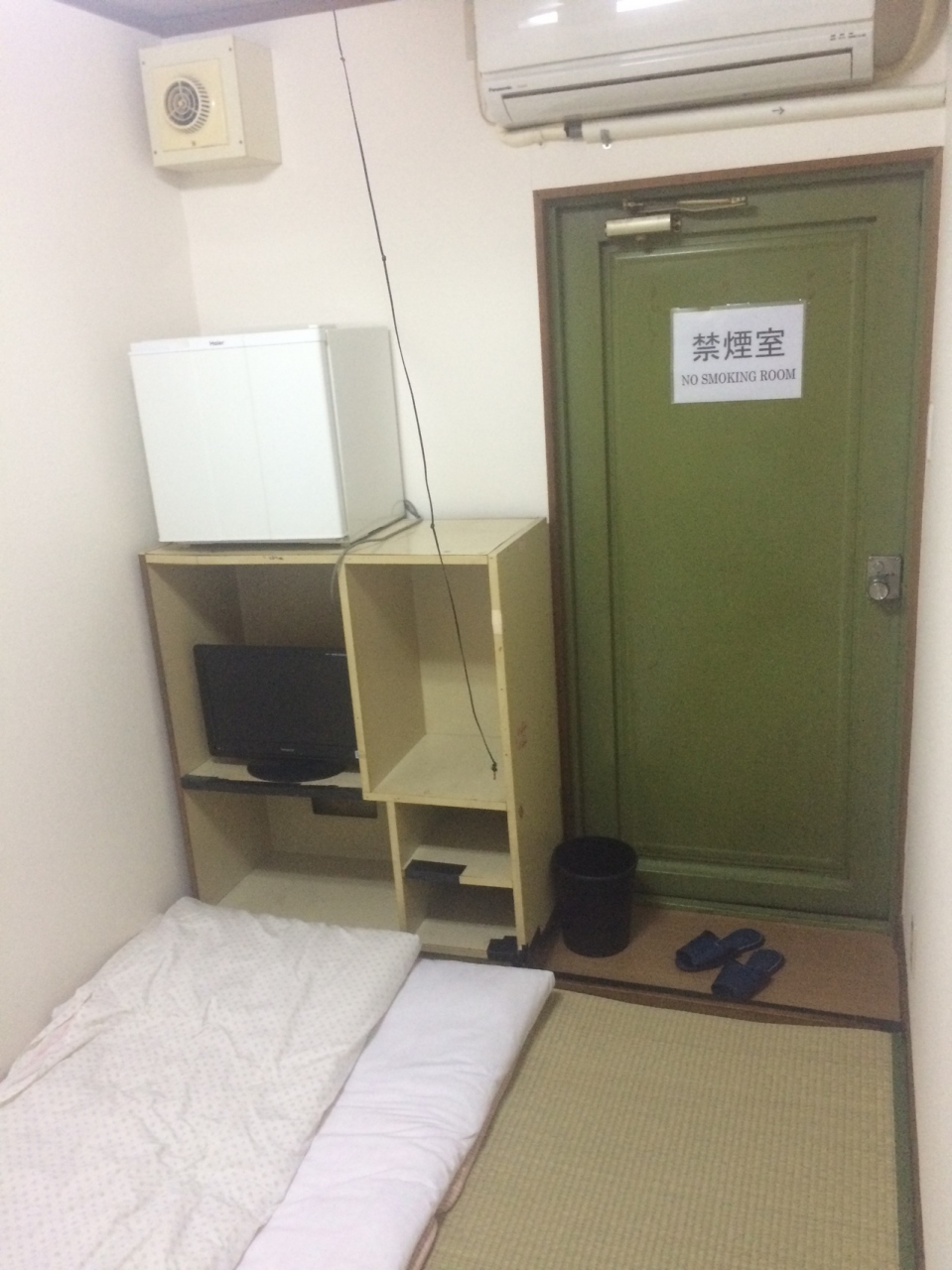 チェックイン時に料金の他に1000円に鍵代として1000円払い、チェックアウト時に返金してもらうシステムです。3畳の和室でテレビ、エアコンと冷蔵庫がありました。浴場もあり浴室はジェットバスだったのが良かったです。他にシャワー専用ルームもありました。wifiはフリーwifiが利用出来ました。電子レンジ、洗濯機もらう完備しています。老朽化眼下目立ちますが必要なものは揃っていました。歯ブラシ、タオル、寝巻き等のサービスはないです。