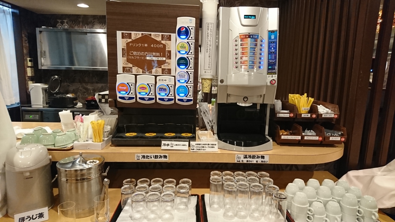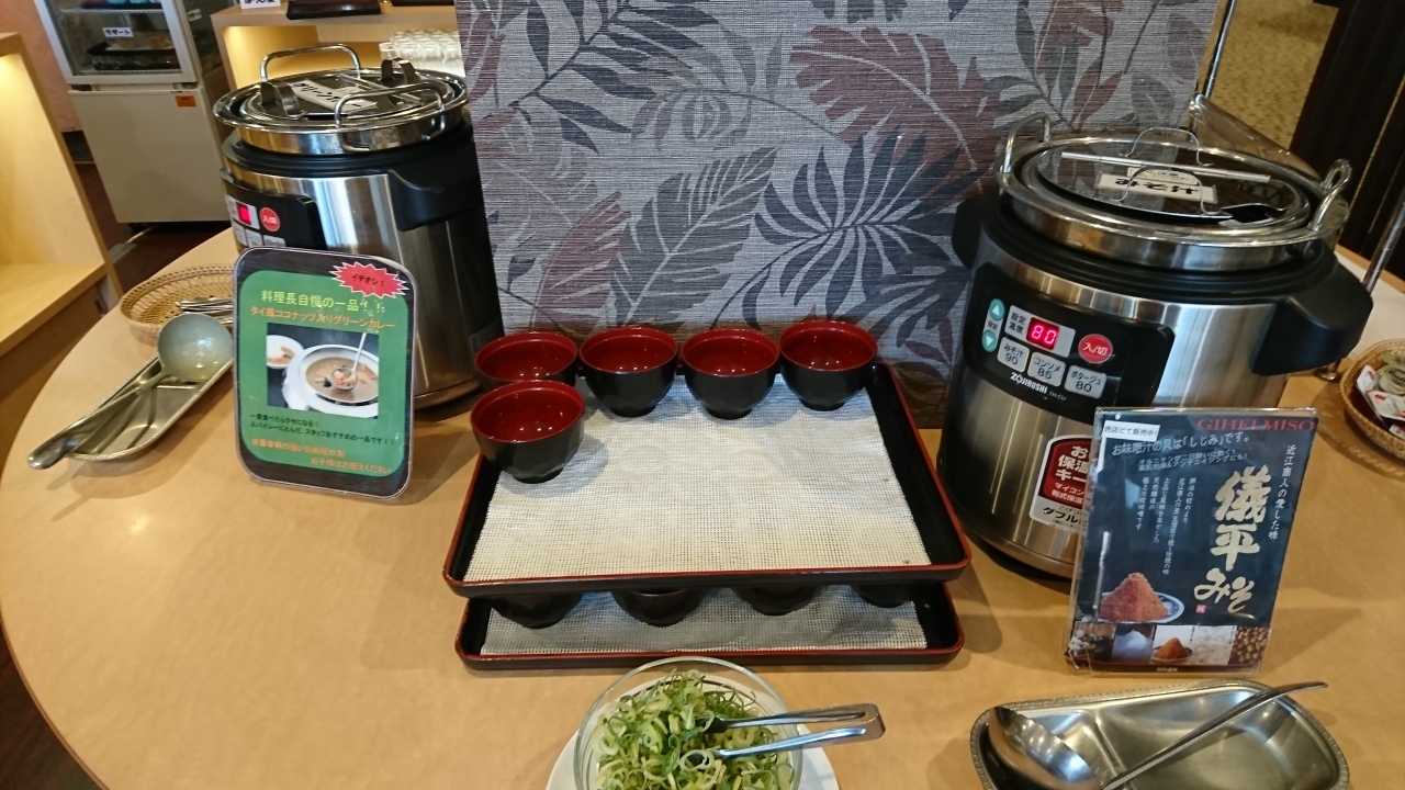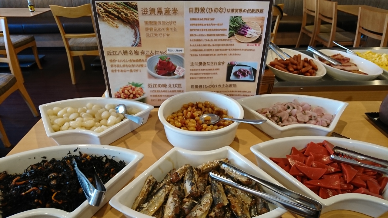 朝食ビュッフェには滋賀のご当地グルメの赤こんにゃく・えび豆・日の菜漬などがあり、朝食会場は15~23時の間は無料でドリンクを飲めるセルフカフェになっていてよかったです。