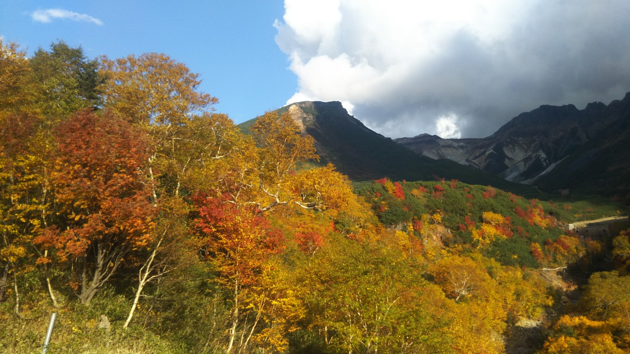 凌雲閣の前にある展望台からは十勝岳のすばらしい紅葉が広がっています