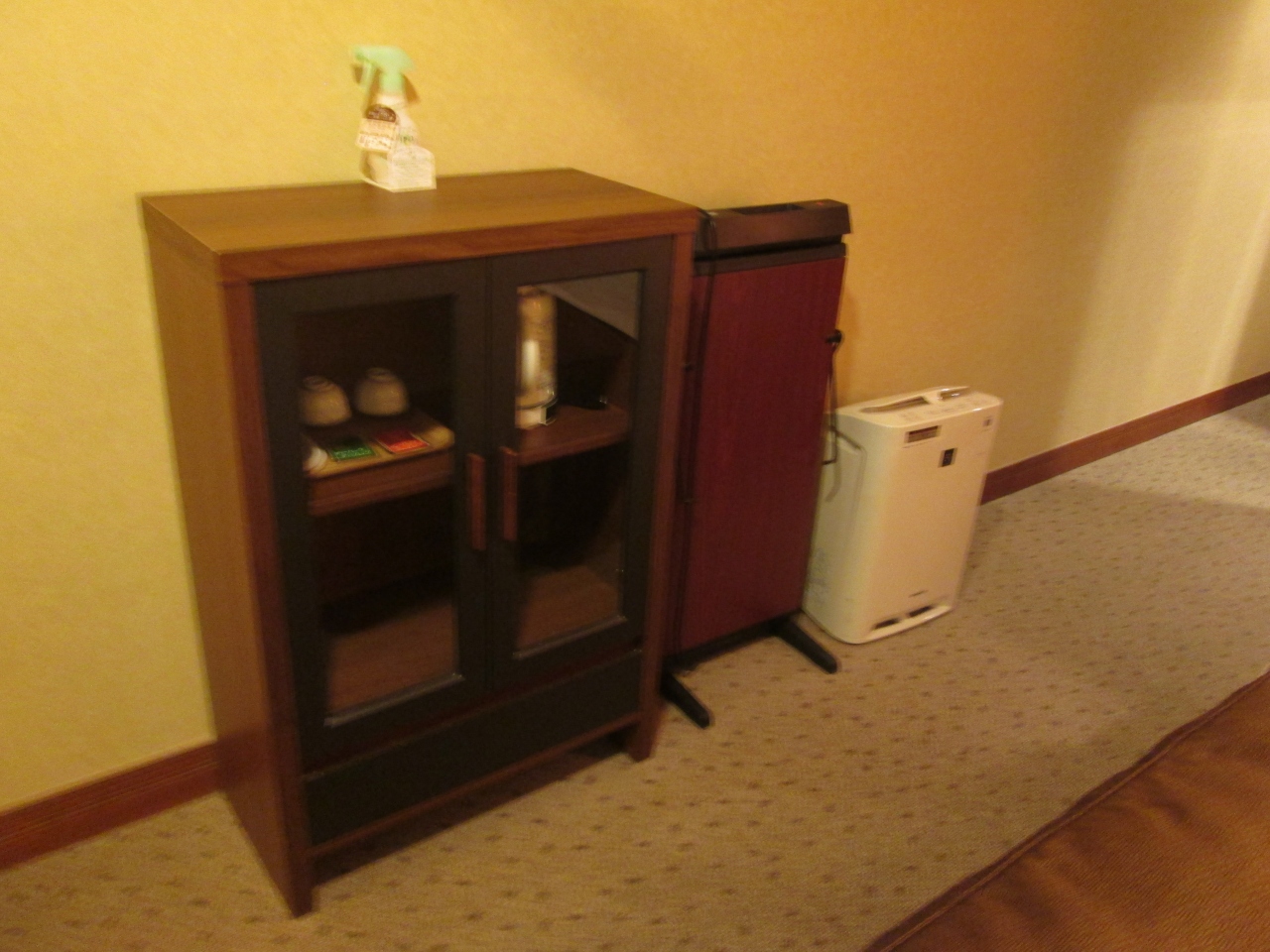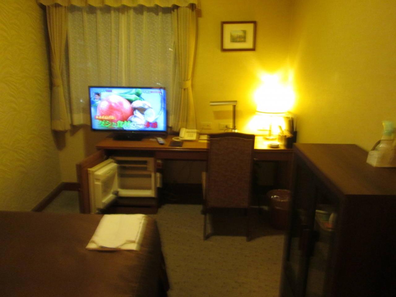 三宮の居留地地区にあるおしゃれな場所にイタリア風の雰囲気のある外観でしたが、客室はいたって昭和のビジネスホテルを感じる。小さめのテレビにミニ冷蔵庫が置かれていた。また、古さを感じる木製の棚にお茶が飲めるセットが置かれていた。