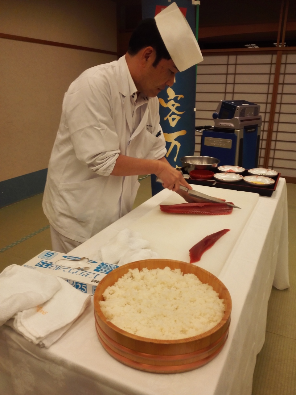 夕食は海鮮物が中心で11品もついて、食べきれないほどのボリュームで、総料理長による、名物料理のてごね寿司の実演などもあり、どの料理もおいしくいただきました。