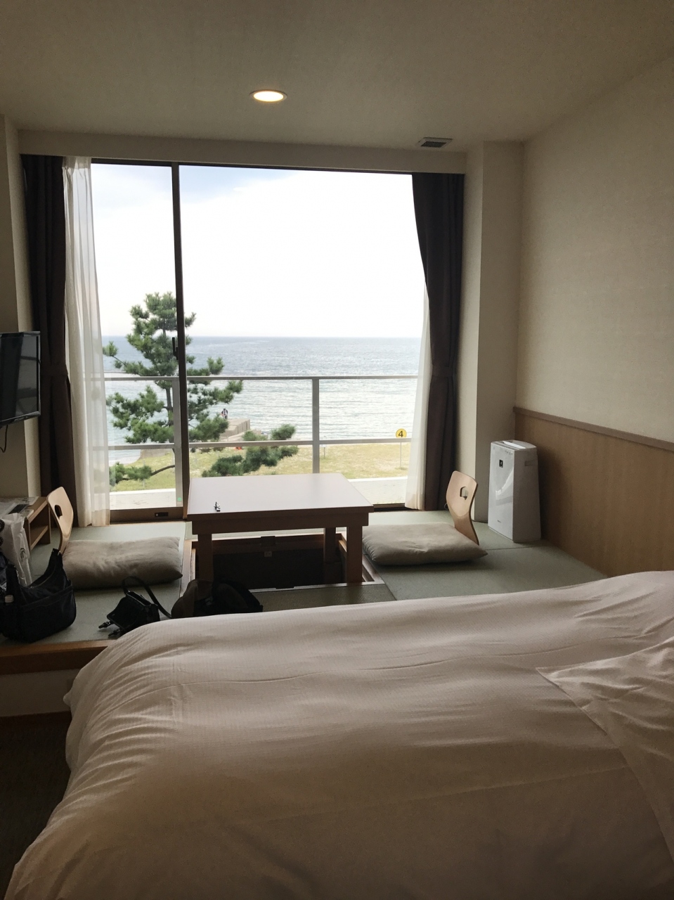 日本海の目の前の温泉ホテルです。部屋からビーチや散歩道も見え、気持ちの良いところでした。まだ新しいのか館内も部屋も綺麗です。浴衣は好きな模様やサイズを好きに選んで温泉へ持って行けます。一部ペットもOKな部屋もあるようです。