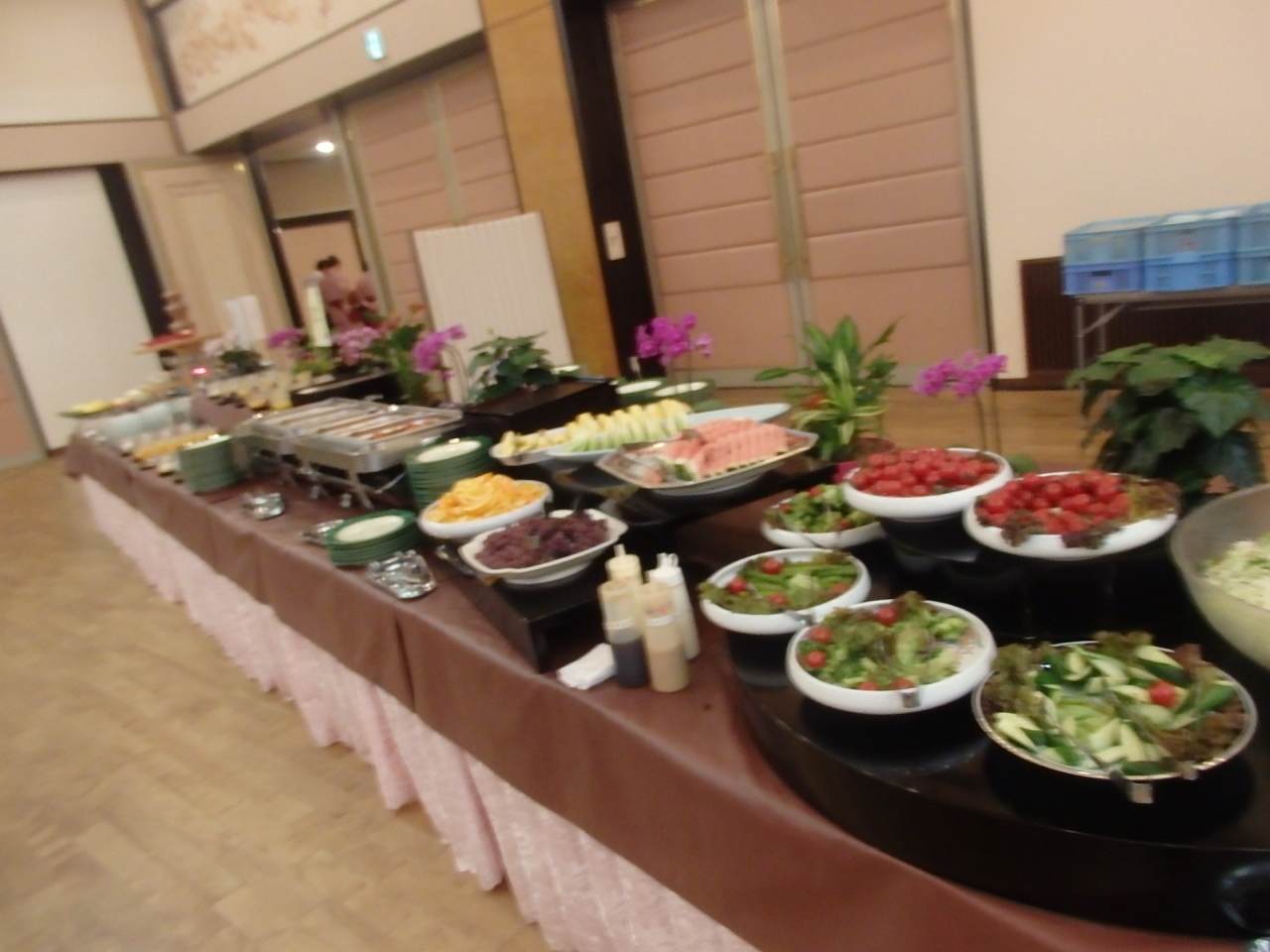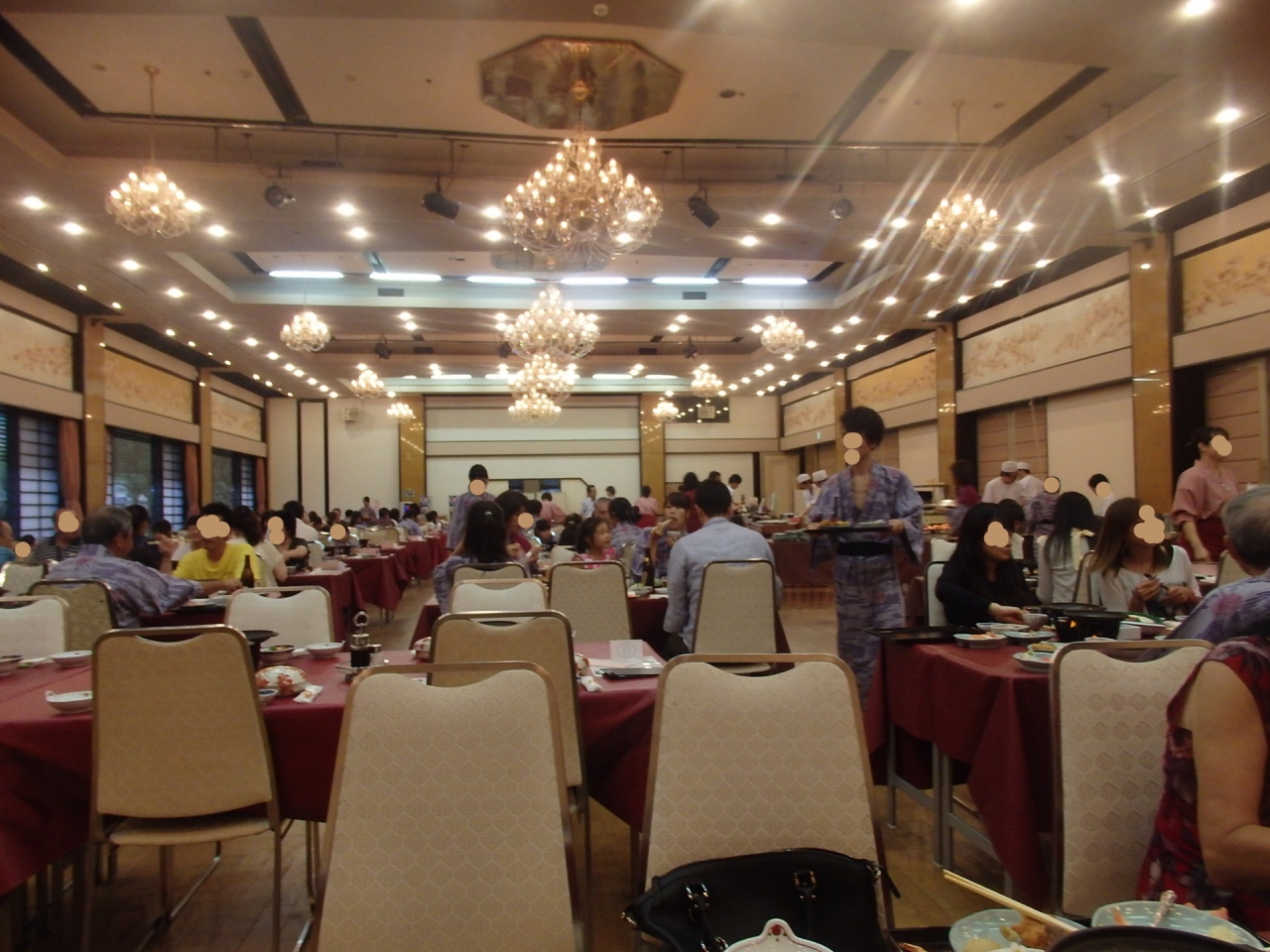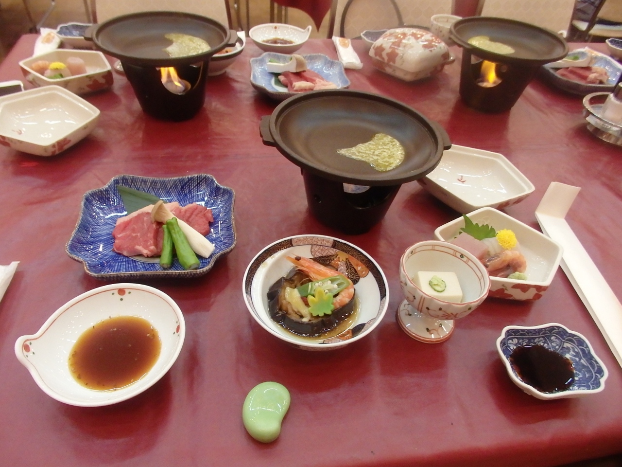 夕食は、和風のハーフバイキングでした。一人ずつ、刺身や牛鍋などがついていて、一方で、揚げたての天ぷらやうどん、サラダやデザートなどがバイキングになっていて、満腹になるまで味わえました。