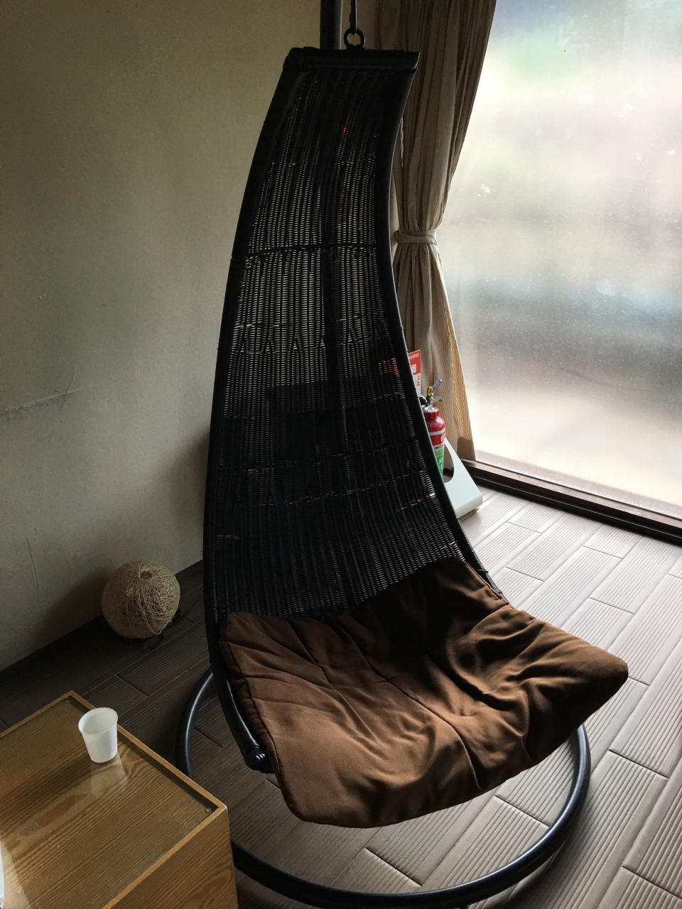 (4)温泉は、開放感たっぷり露天風呂があり、とても気持ち良く過ごせました。露天風呂は、森の中にありながら、広い空を感じることができるものでした。温泉の休息所は、男女共通で、湯処とは別に設けられていました。ここのチェアーが、ゆりかごのようで、ゆったり出来ます。ちょっとした楽しい時間となります。