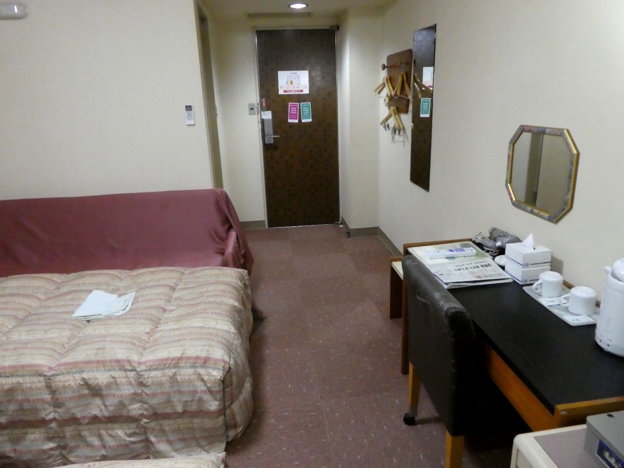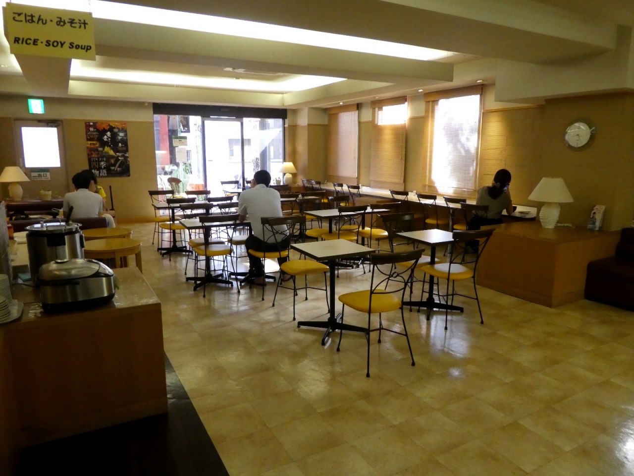 路地裏側のホテル本来の入り口からエレベーターで二階に上がるとフロントがあり、フロントの右奥が朝食会場の食堂です。その食堂の奥にあるドアが前述の居酒屋右側の階段に通じています。私のシングル一泊\3800プランは朝食付でした。朝食内容はパンだけでなくサラダや味噌汁やご飯、納豆、漬物類もあって、パンと珈琲だけのいわゆる軽朝食よりは満足感が得られます。個人的には野菜サラダが無料食べ放題なのは嬉しい。繁華街での夜の食事は内容が肉類に偏るので、朝食で野菜を食べて栄養のバランスを取る事ができます。朝食会場に置いてあるドリップ珈琲マシンは午後三時以降はウェルカム・ドリンクとして稼働しており、宿泊者は無料で飲む事ができます。