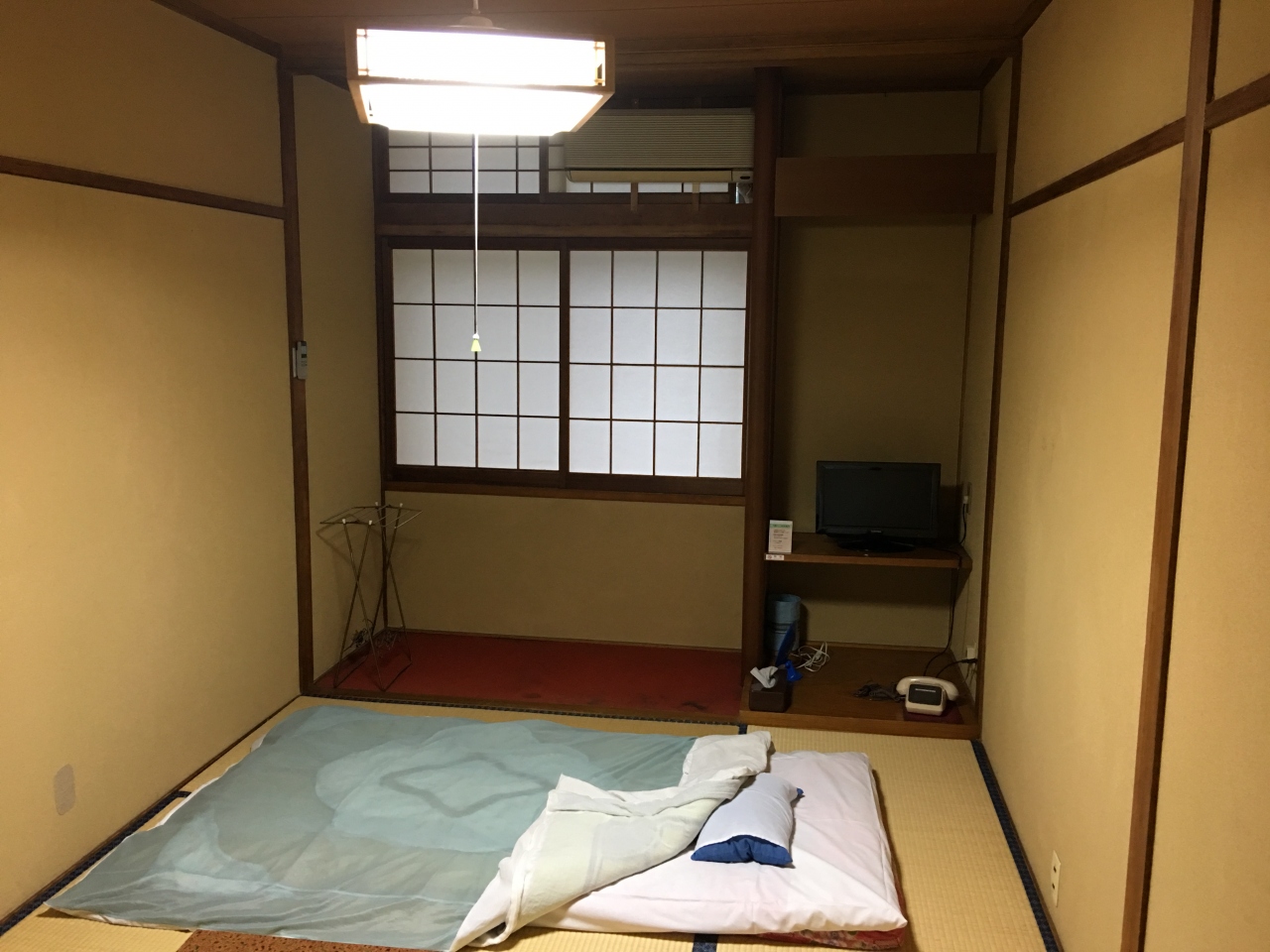 ・小さな煎餅布団。硬くて足が出そう。寝苦しい。