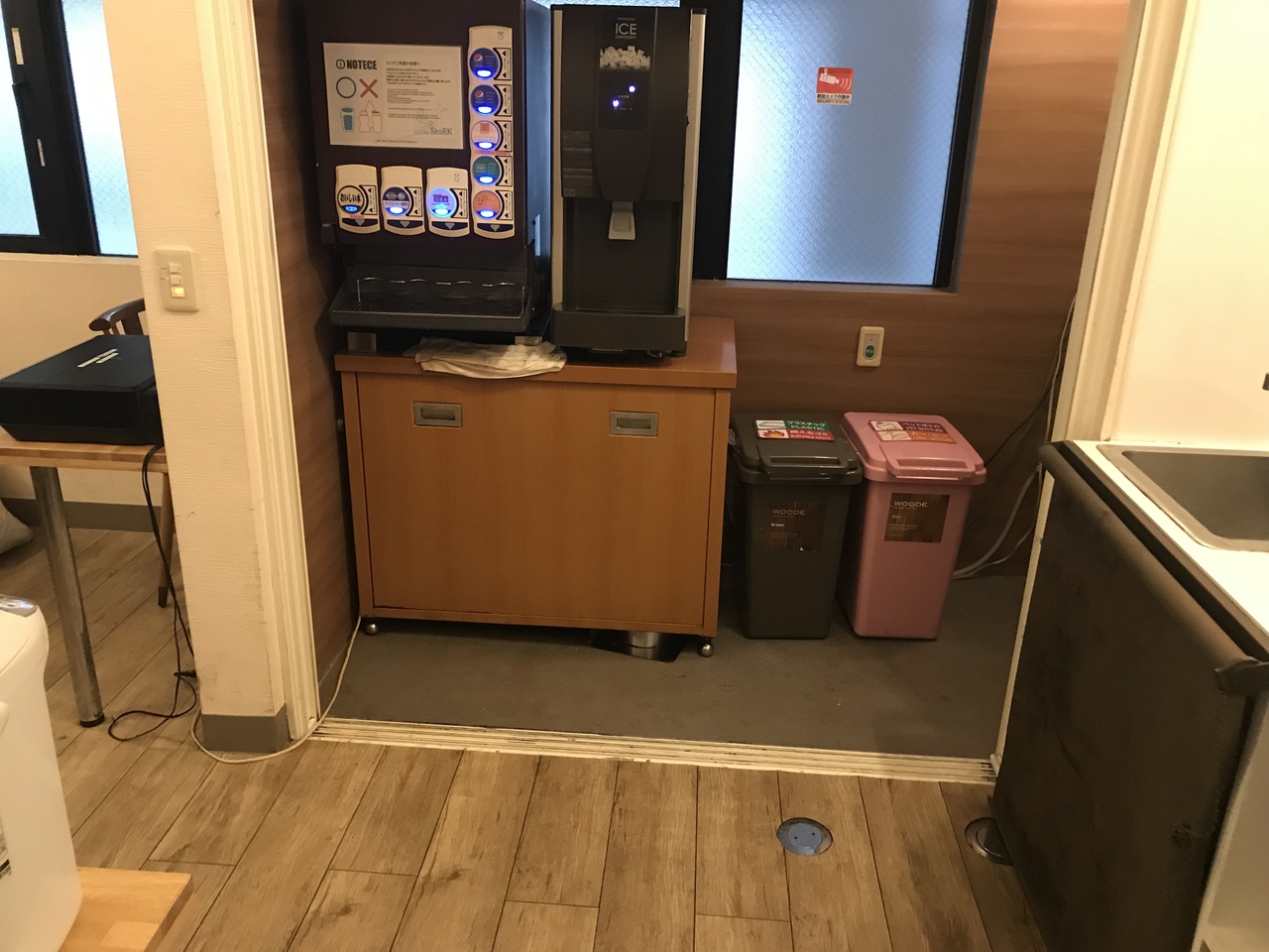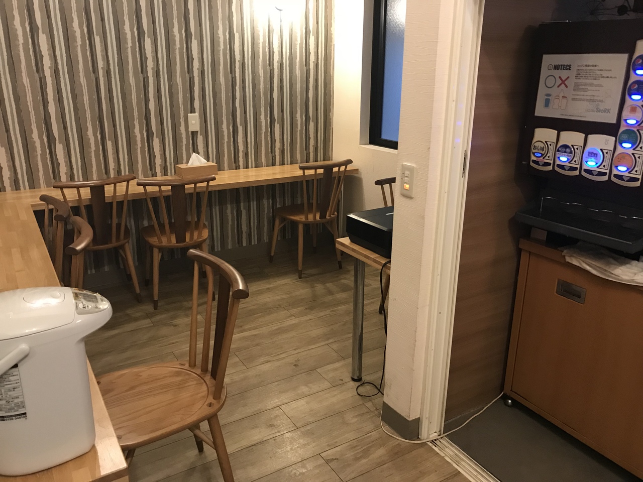 ゆいレールおもろまち駅から徒歩15分、有料駐車場もあります。外観はスリムな建物という印象です。 フロントでチェックイン手続きを済ますと、後方にある精算機で支払いを済ませるスタイルのためカードでの支払いはできません。エレベーターな2基。wifiあり。1階エレベーター奥には共用スペースがあり、電子レンジ、電気ポット、コーヒーやお茶、コーラ、炭酸飲料などのフリードリンクと製氷機、パソコン1台とプリンターがありました。