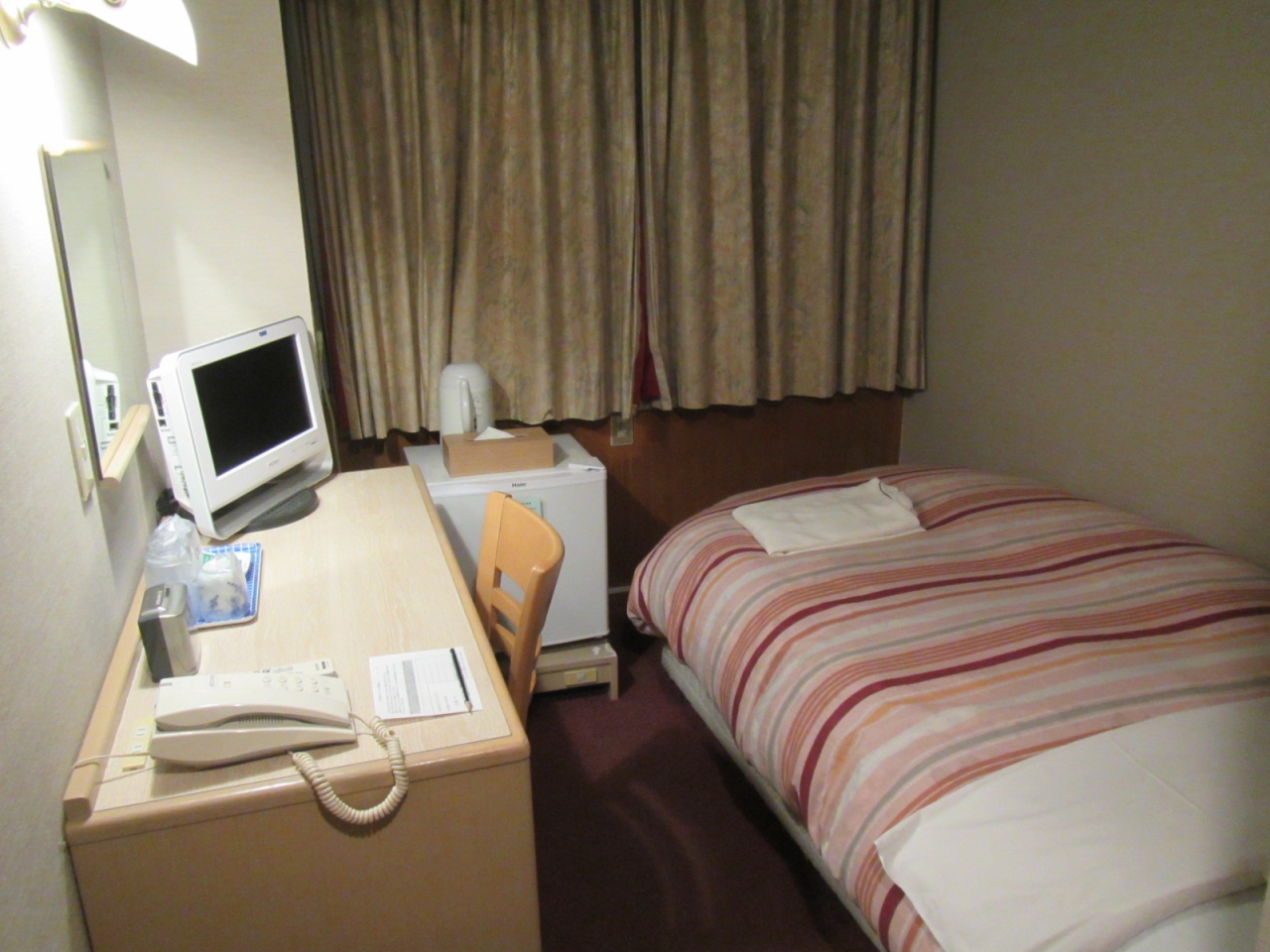 部屋はシンプルなビジネスホテルの個室のため、広くはありませんが、ただ泊る分には、カプセルホテルなんかよりよっぽど快適に過ごせます。