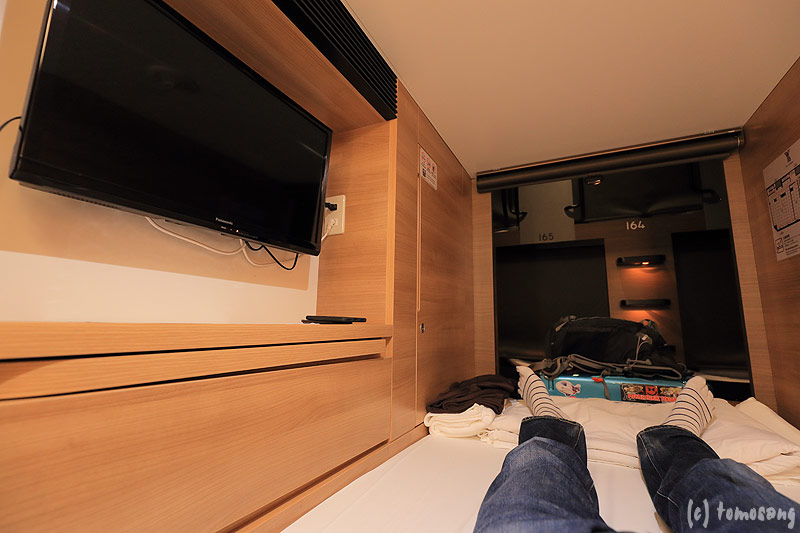 カプセルの有る部屋は全体的にダウンライトされていて薄暗い。到着時、最初は個室内の照明スイッチの場所がわからなかった。居住スペースは布団一枚分くらい。テレビとロッカー有り。ロッカーは室内着に着替えた後に、自分の服を入れられる程度の大きさ。衣類を着込む冬場だと全部入らないのではなかろうか。スーツケース等はフロントに預けるか、廊下へ置くことになる。