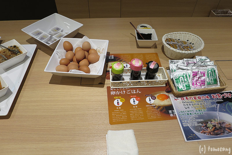 朝食はお茶漬けか卵かけご飯。漬物で食べるも良い。味噌汁やちょっとしたおかずも用意されている。ドリンク類は飲み放題。