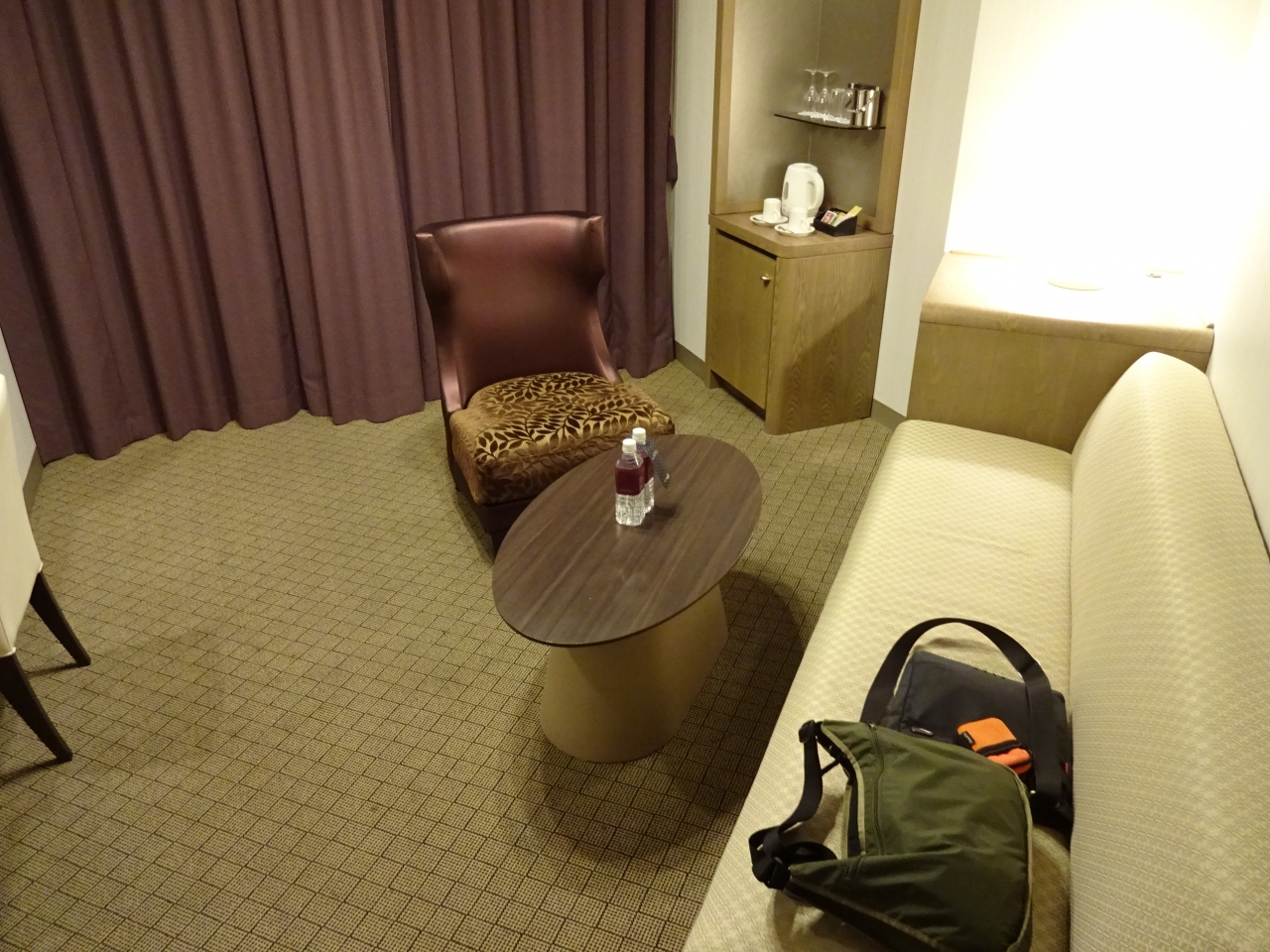 部屋にはソファーがあり、テレビを見るときやくつろぐ時に重宝しました。部屋の中央にデスクがあるのが特徴的でした。
