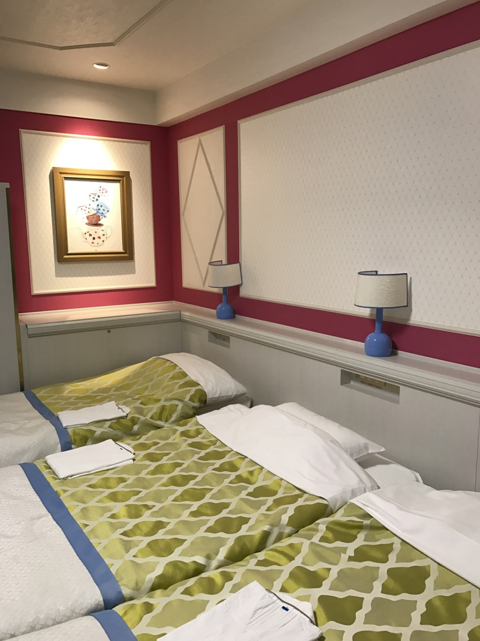 「不思議の国のアリス」がテーマのお部屋で、写真をたくさん撮りました。ただ、大人2人と子供2人で泊まったのでベッドが隙間なくギューギューで身動きが取れず狭かった。朝食ビュッフェは普通に美味しかったです。