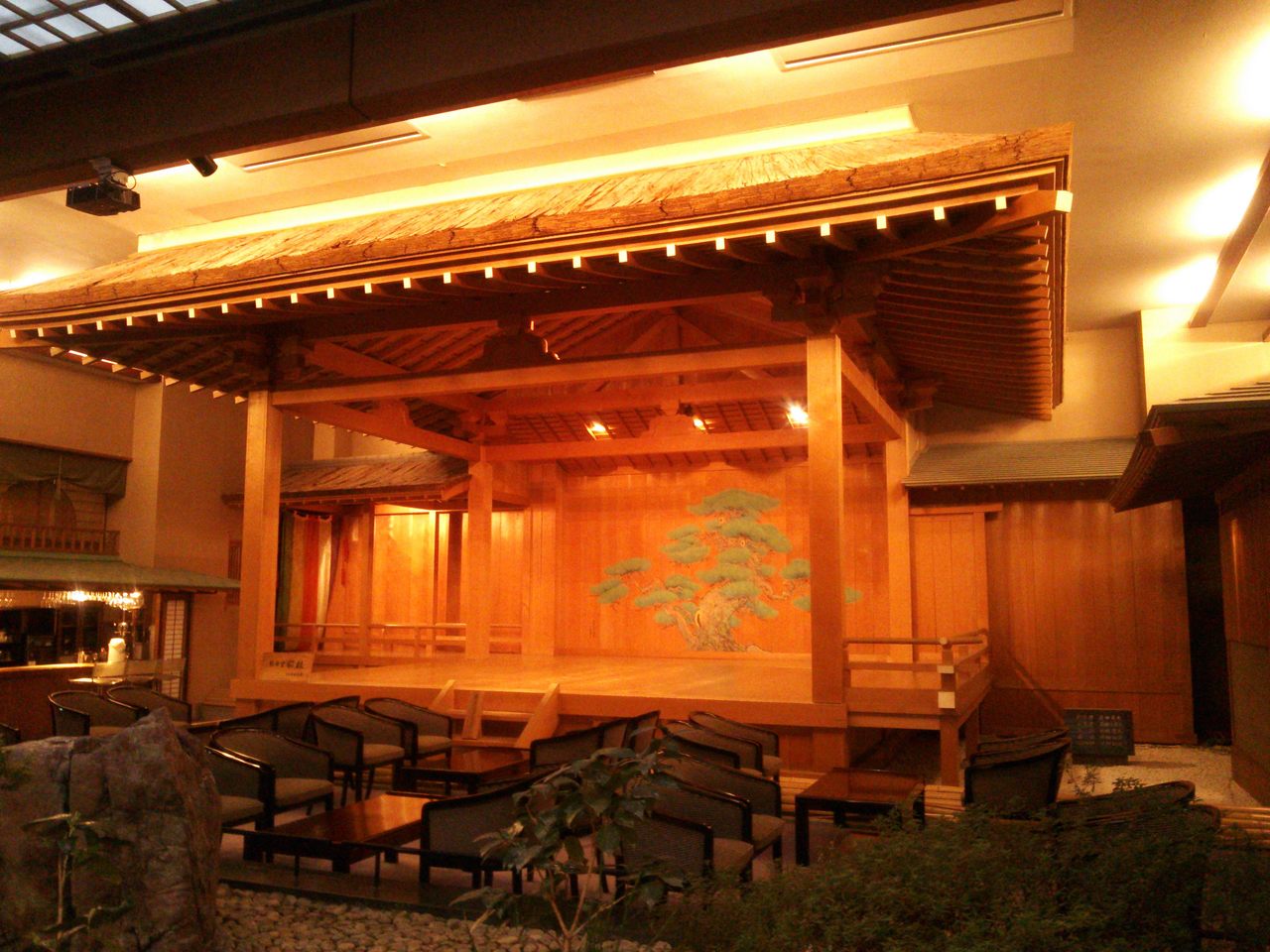 旅館に入ると、玄関ですぐに靴を脱ぎ、館内では楽なスリッパで過ごせます。フロント目の前には、立派な舞台があります。夜になると、和太鼓のショーが開催されました。日により、ショーが変わり三味線や舞踊もあるそうです。