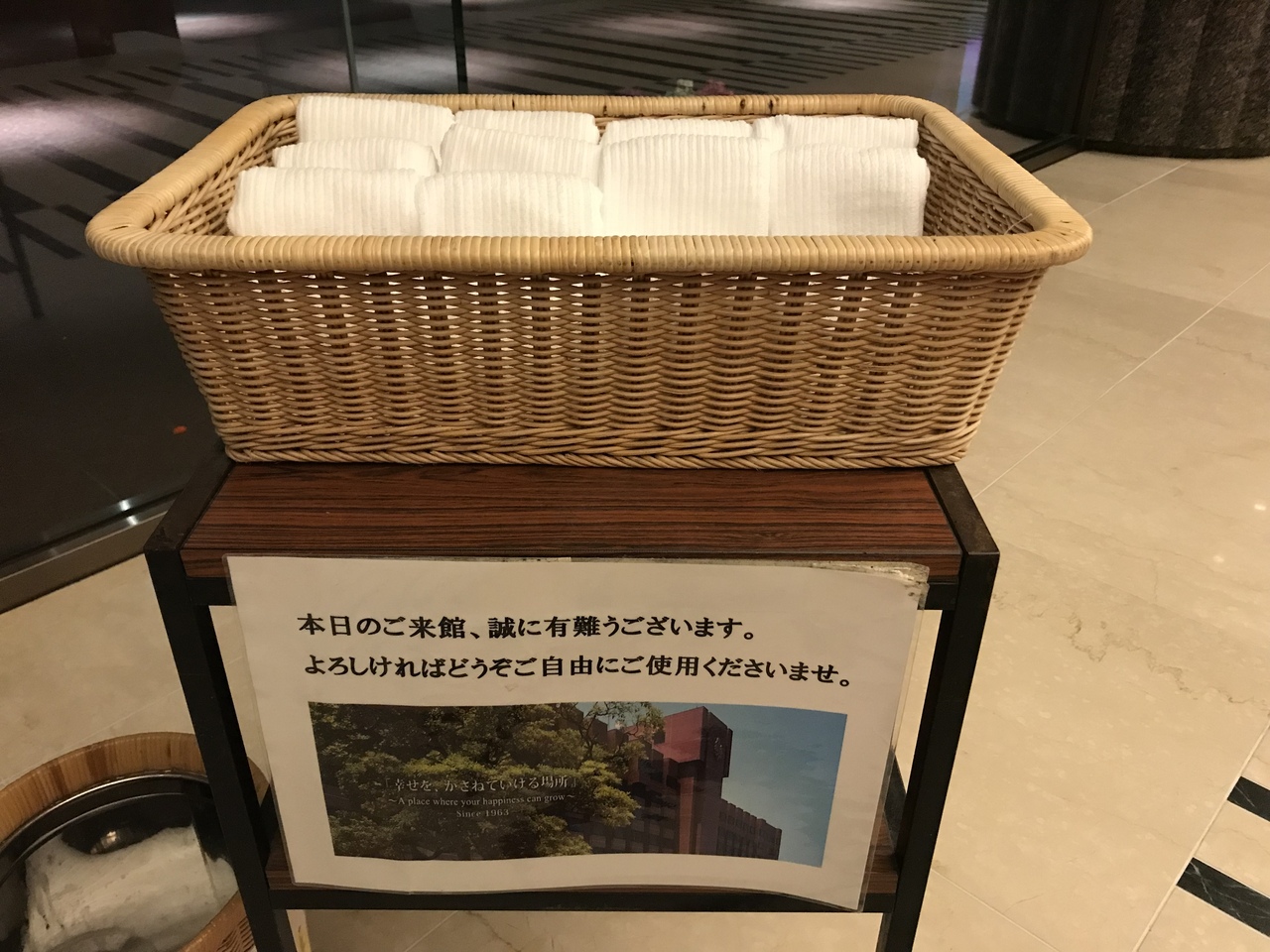 行った日は小雨が降るあいにくの天気でしたが、入口を入ると白いタオルが用意されていて「どうぞ ご自由にお使いください」と書いてありました。