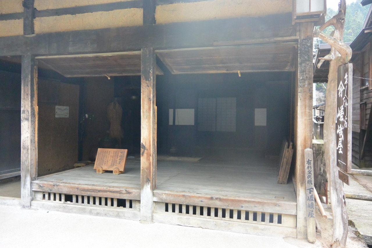 枡形跡のところを右手に降りて行くと道に面してオープンになった下嵯峨屋の部屋を見ることができます。部屋は板張り、囲炉裏もあり、蓑や道具なども少し展示されていました。庶民はこういったところに住んでいたんだなあと実感することができます。