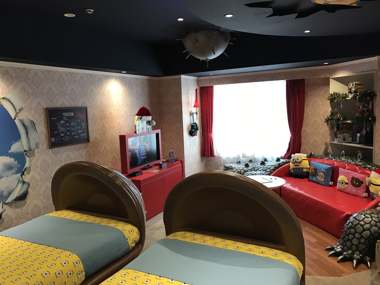 たまたま空きがあったため、12月の土日にミニオンルームに宿泊しました。部屋の前からミニオンで、中ももちろんミニオンです。予想以上に可愛いくて良かったです。しかも12月なので、部屋の中もクリスマス仕様でした。ちなみに部屋ではミニオンのDVDが初めから流れてます。オススメです!
