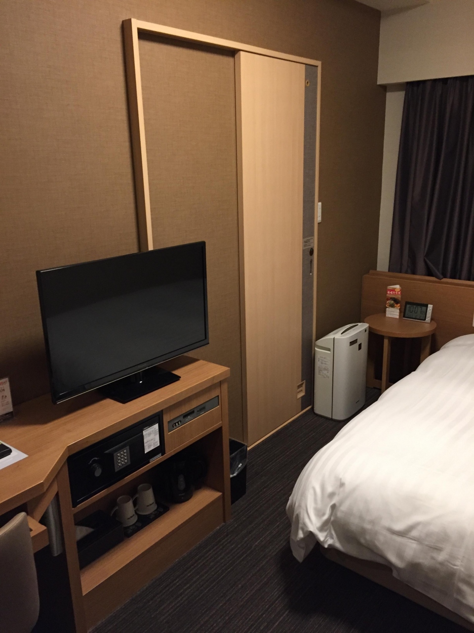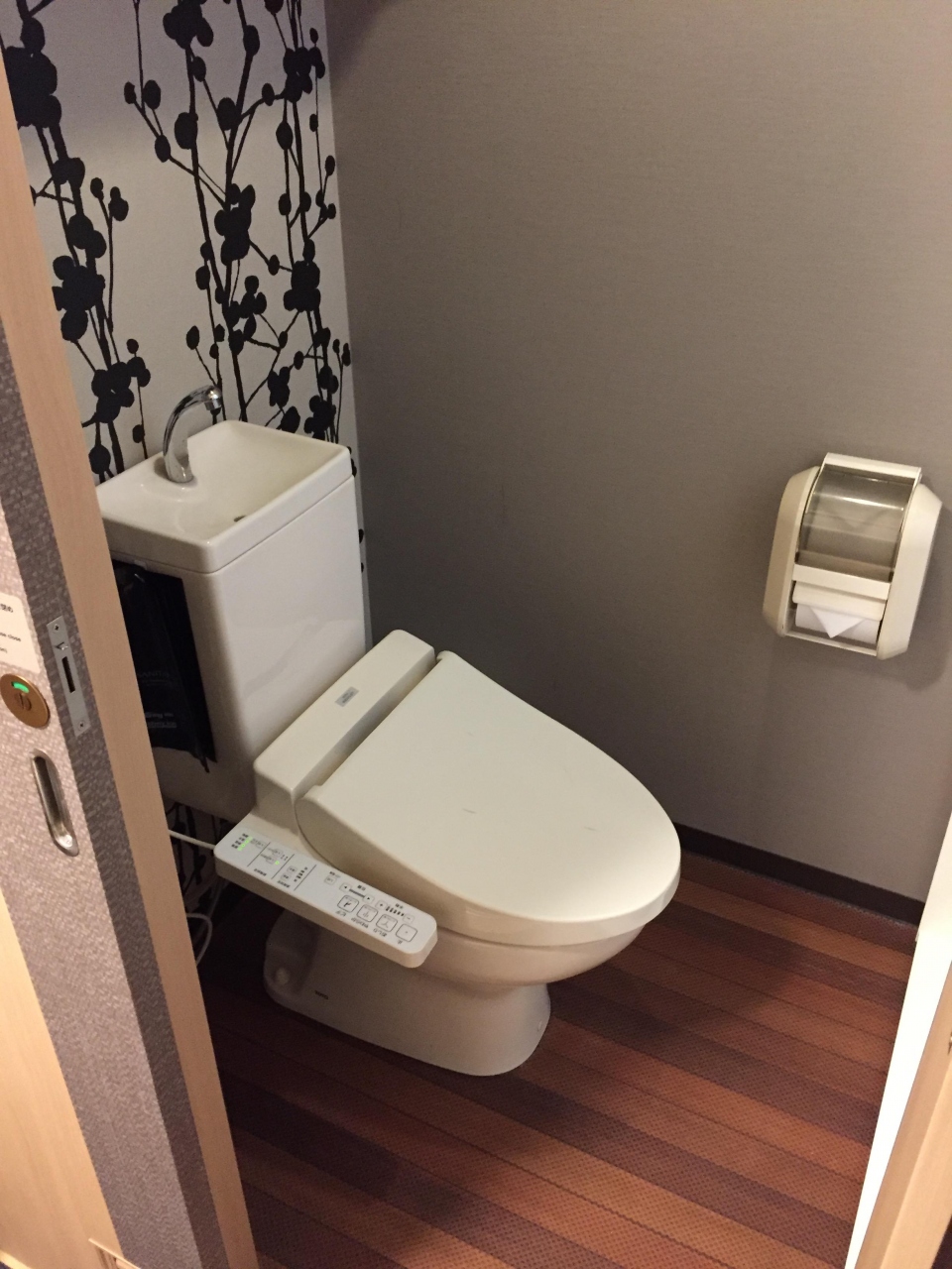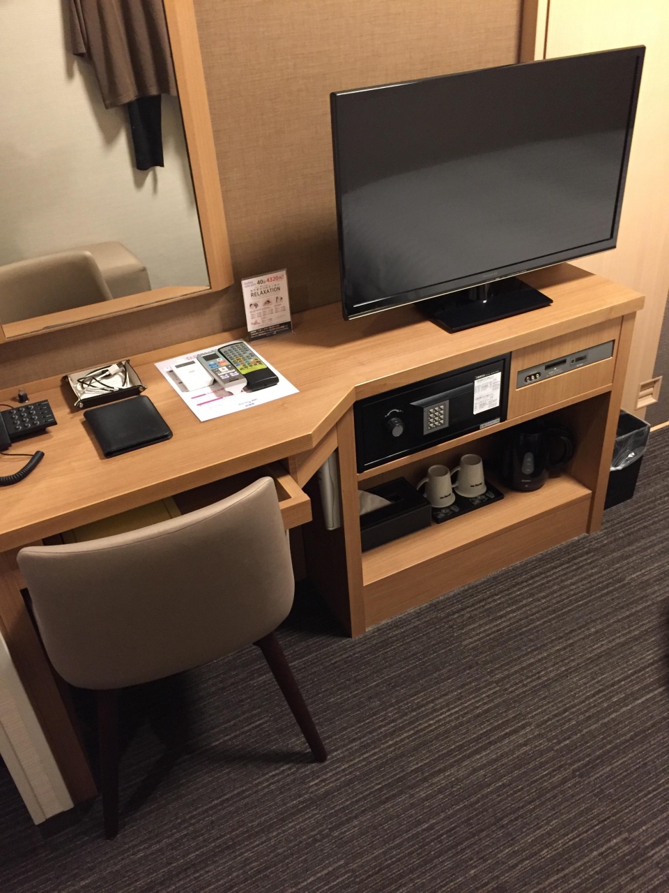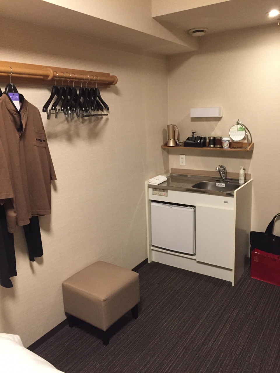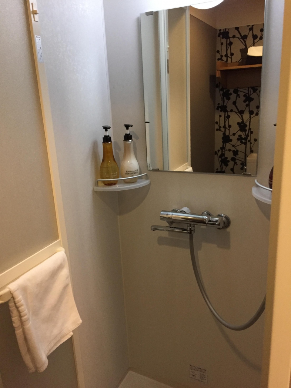 大浴場があるためか部屋にはシャワーブースだけしかありません。トイレとシャワースペースは何とか配置したと思えるぐらい狭いですがビジネスホテルとしては必要なものは揃っていました。