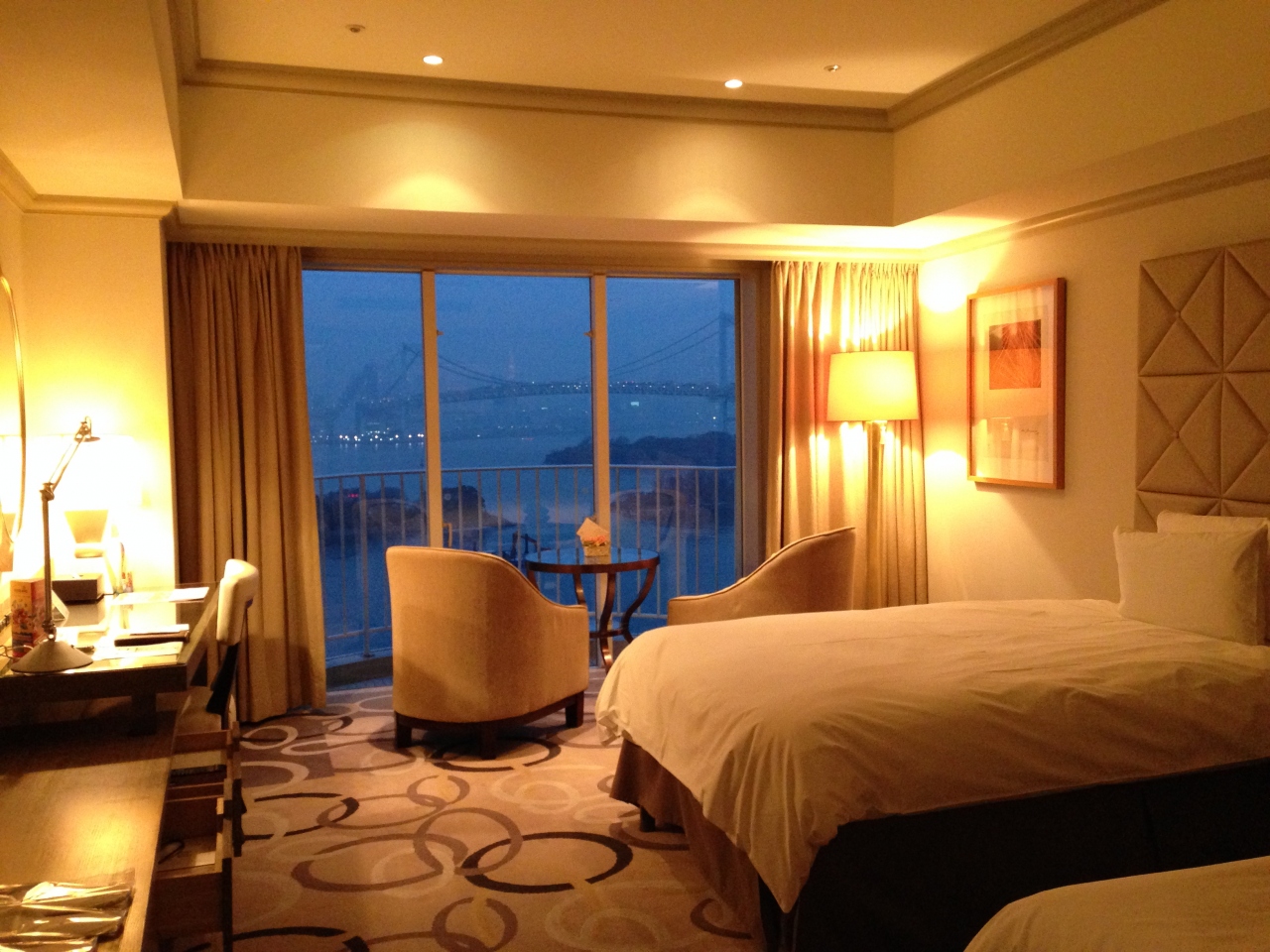 オーソドックスながら品のよい客室、海や橋の入り混じった景色や