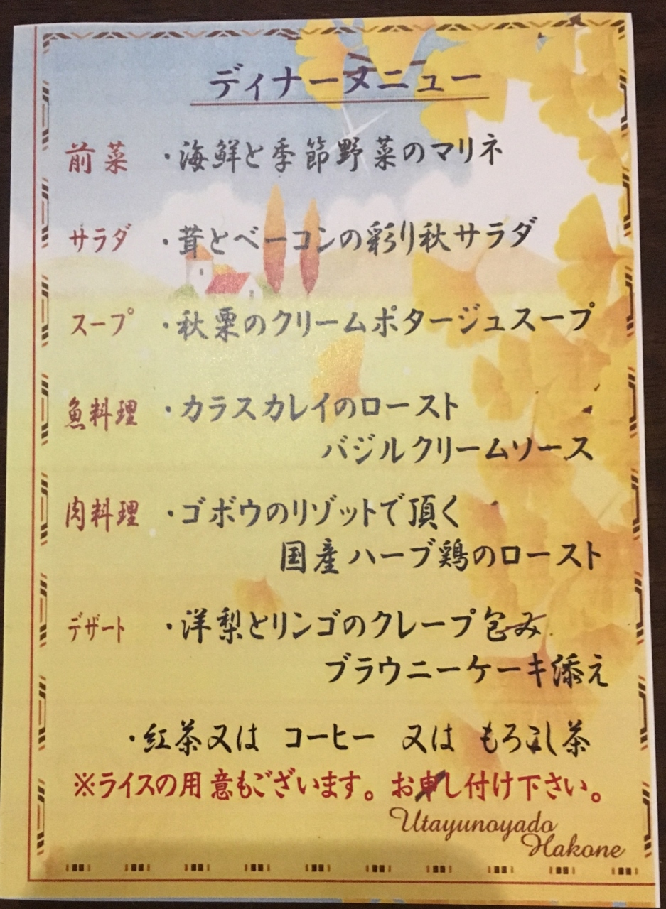 箱根の温泉宿で1人税込1万円弱でディナー、朝食込みというお安さでした。
